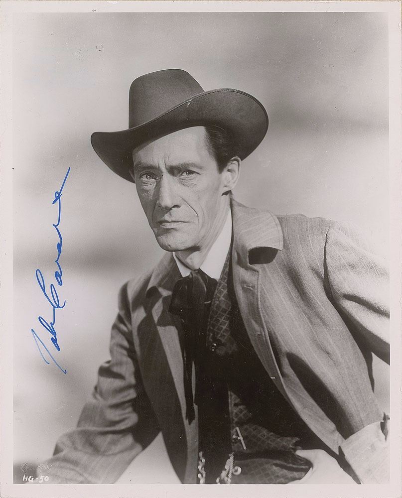 Glossy 8 x 10 studio portrait of Carradine wearing a western outfit, vertically signed in blue felt tip. In fine condition, with scattered light crazing, and rippling to the top from some tape along the reverse top edge. From the Harvey and Rhoda Kuflik Collection.