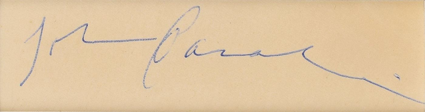 Ballpoint signature, "John Carradine,” on an off-white 3.75 x 1 sheet. Matted with a photo of Carradine with an intense expression to an overall size of 11 x 15. In fine condition.