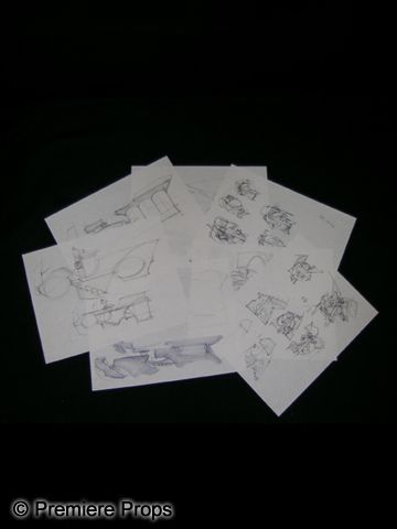 This is a lot of 7 pages of hand-drawn sketches for the 2012 Sci-Fi film 'John Carter.' Sketched under Eric Brevig's supervision, Visual Effects supervisor at ILM, the sketches show weapons designs and what appears to be a transportation module. Written on the lower left corner of the front page is 'P of Mars,' likely referring to Edgar Rice Burroughs book, and the early title of the film 'Princess of Mars.'