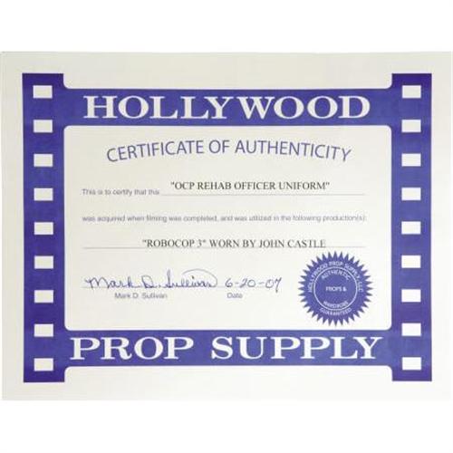 <B>John Castle Costume from "RoboCop 3".</B></I> An OCP rehab officer's uniform consisting of a light grey shirt with shoulder boards and matching slacks, worn by actor John Castle in the 1993 sequel. In Excellent condition, with the character's name ("McDaggett) written inside the collar. <I>Accompanied by a COA from Hollywood Prop Supply.</B></I> <BR><BR><b>Shipping:</b> Clothing, Costumes & Jerseys (<a target="_blank" href="http://www.heritageauctions.com/common/shipping.php">view shipping information</a>)