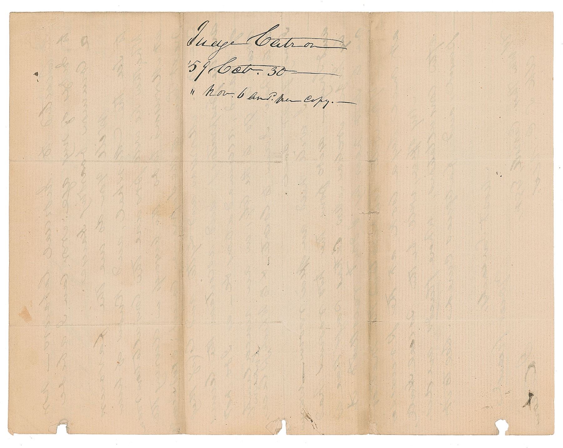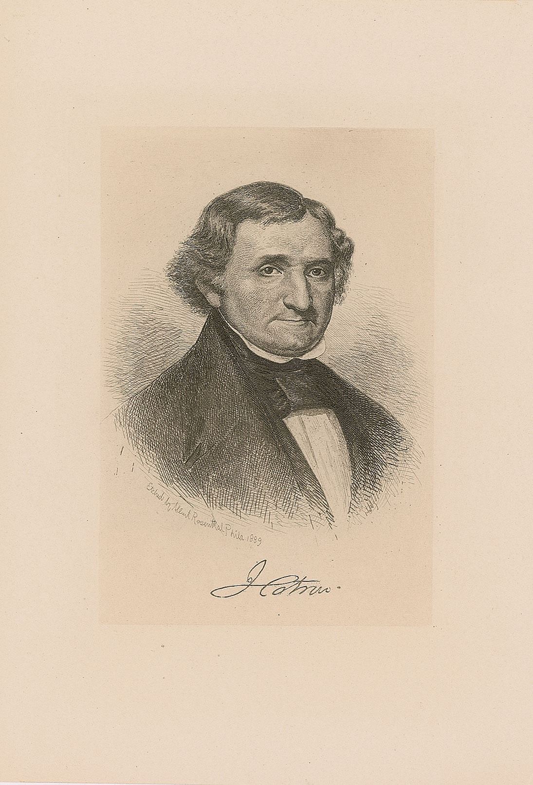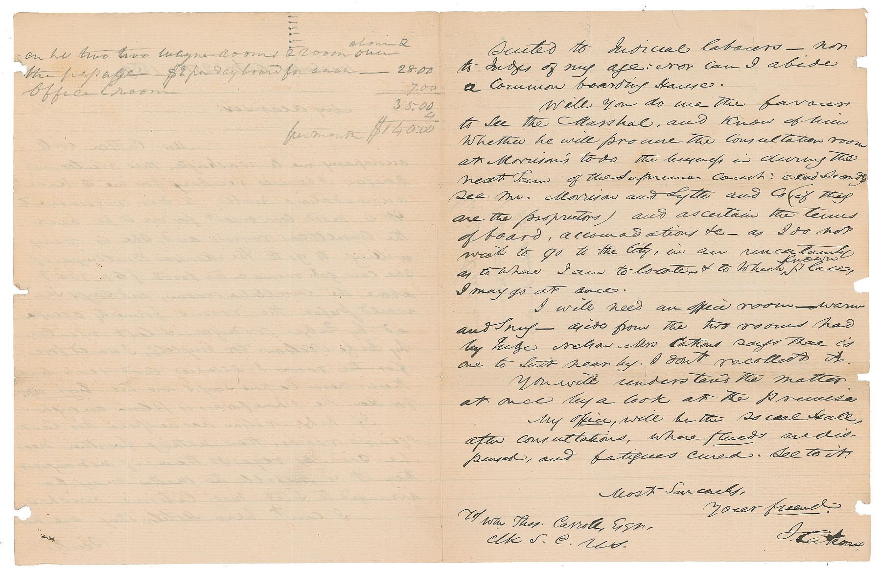 ALS signed “J. Catron,” two pages on two adjoining sheets, 8.25 x 10.5, October 25, 1859. Letter to Clerk of the Supreme Court William Thomas Carroll, in part: "Mrs. Catron will accompany me to Washington this Winter, and therefore it becomes necessary for me to have accommodations suited to her requirements. It is most convenient for me to be near the Consultation room; and, she is very willing to go to the Morrison buildings, if she can get rooms on the first floor…and says she would prefer the rooms formerly occupied by Judge Wayne—& last winter by Judge Nelson. For myself, I would prefer the rooms I occupied last year, but these Mrs. Catron says are too high up for her…If Judge Nelson has bespoke his last year's rooms, then nothing further need be said, as regards them…I can't be at hotels; they are not suited to Judicial Labours—nor to Judges of my age: nor can I abide a common boarding house. Will you do me the favour to see the Marshal, and know of him whether he will procure the Consultation room at Morrison's to do the business in during the next term of the Supreme Court…and ascertain the terms of board, accommodations, &c…I will need an office room—warm and snug—aside from the two rooms has by Judge Nelson. Mrs. Catron says there is one to suit near by. I don't recollect it." In very good to fine condition, with three binder dings to the right edge, touching only one word of text. Accompanied by an engraved portrait bearing a facsimile signature.