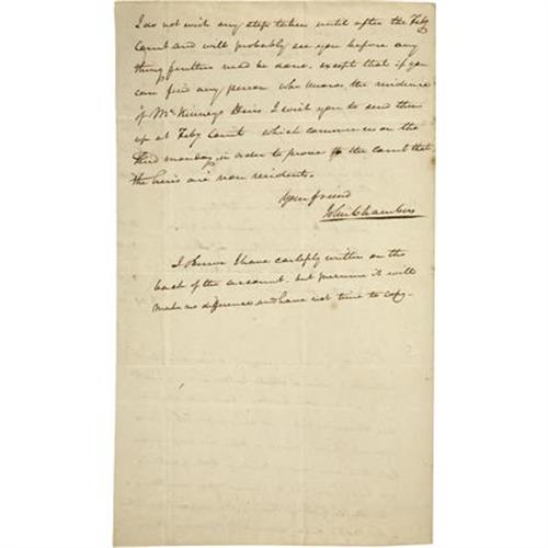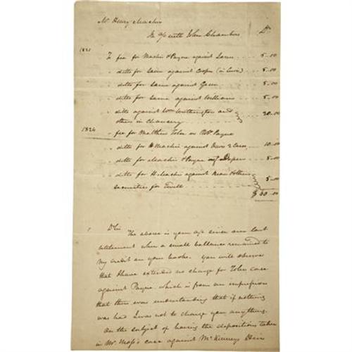<B>John Chambers, Aide to General William Henry Harrison During the War of 1812 Autograph Letter Signed</B></I> "<I>John Chambers</B></I>". Two pages, no date, circa 1826, with the usual fold creases, else very good. In this letter Chambers provides a statement of accounts to an unknown recipient. John Chambers enjoyed a distinguished and varied career including serving as second territorial governor of Iowa, serving in the War of 1812, negotiated treaties with various Indian tribes.<BR><BR><BR><b>Shipping:</b> Flat Material, Small (<a target="_blank" href="http://www.heritageauctions.com/common/shipping.php">view shipping information</a>)