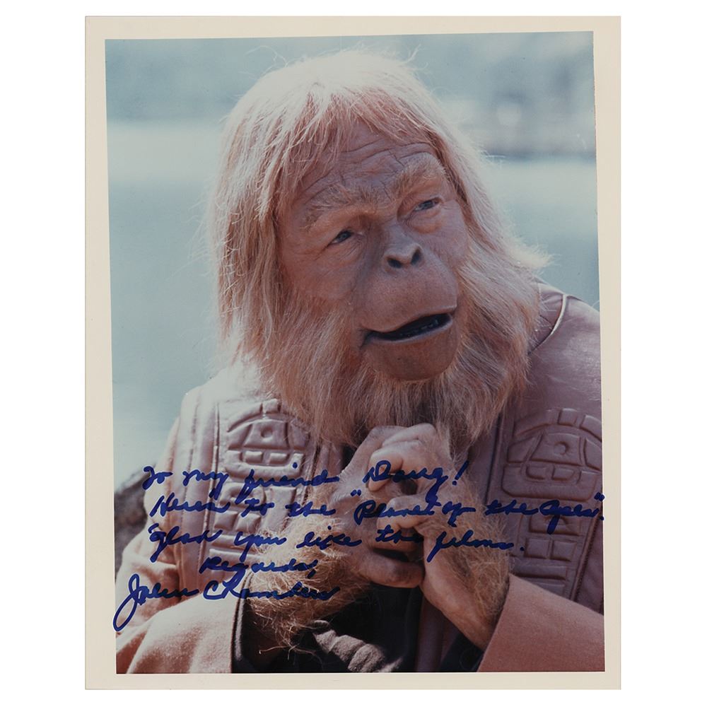 Academy Award-winning make-up artist (1922-2001) best known for his work on Planet of the Apes, as well as designing the pointy ears of Mr. Spock. Color glossy 8 x 10 photo of Dr. Zaius from the Planet of the Apes film series, signed and inscribed in blue felt tip, "To my friend Doug! Here's to the 'Planet of the Apes.' Glad you like the films. Regards, John Chambers.” In fine condition.