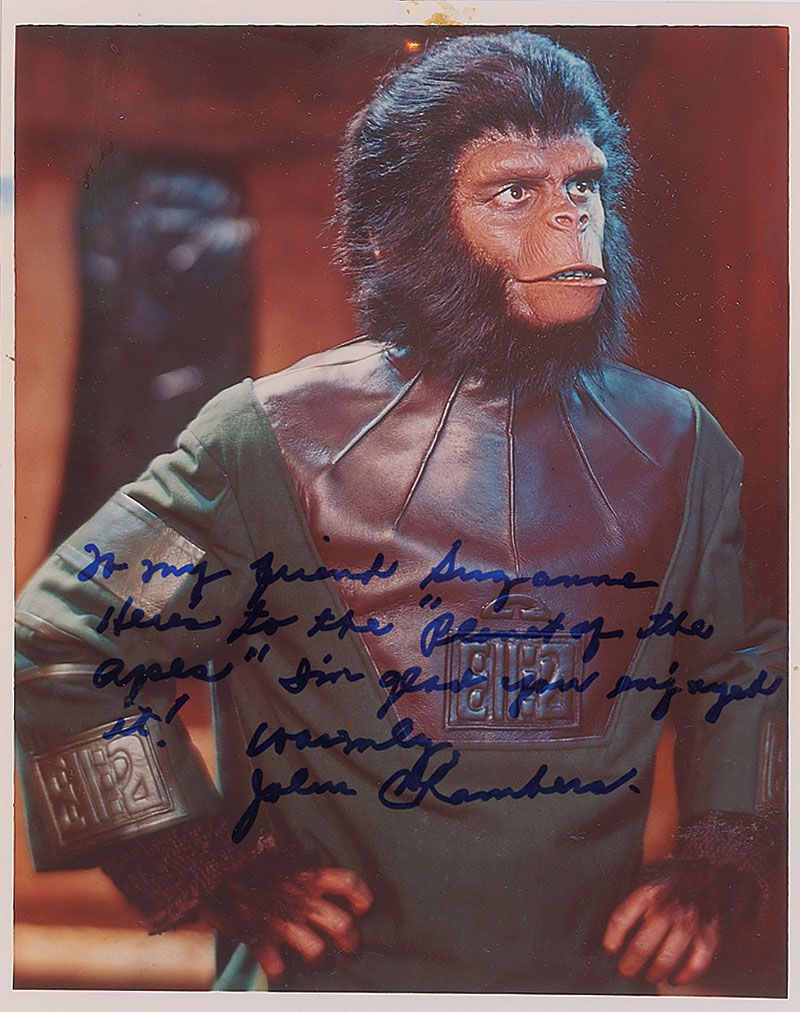Academy Award–winning make-up artist (1922–2001) best known for his work on Planet of the Apes, as well as designing the pointy ears of Mr. Spock. Color glossy 8 x 10 photo of Roddy McDowell from Planet of the Apes, signed and inscribed in blue felt tip, “To my friend Suzanne, Here’s to the ‘Planet of the Apes.’ I’m glad you enjoyed it! Cordially, John Chambers.” Some scattered light rubbing to finish, and some adhesive remnants below signature, otherwise fine condition.