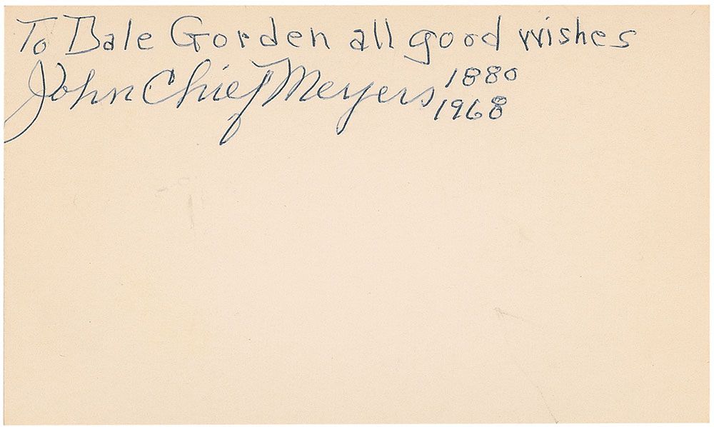 Catcher for the New York Giants, Boston Braves, and Brooklyn Robins from 1909 to 1917. He played on the early Giants teams under manager John McGraw and was the primary catcher for Hall of Famer Christy Mathewson. He was a surprisingly good hitter but was overlooked because he was a catcher. He played in four World Series. The 1911, 1912, and 1913 series with the Giants and the 1916 series with the Robins. Ballpoint signature and inscription, “To Bale Gordon all good wishes, John Chief Meyers 1880/1968,” on an off-white 5 x 3 card. In fine condition.