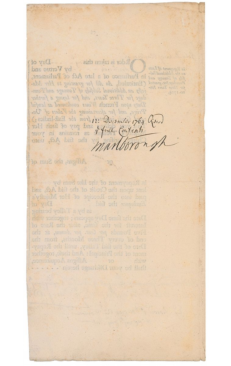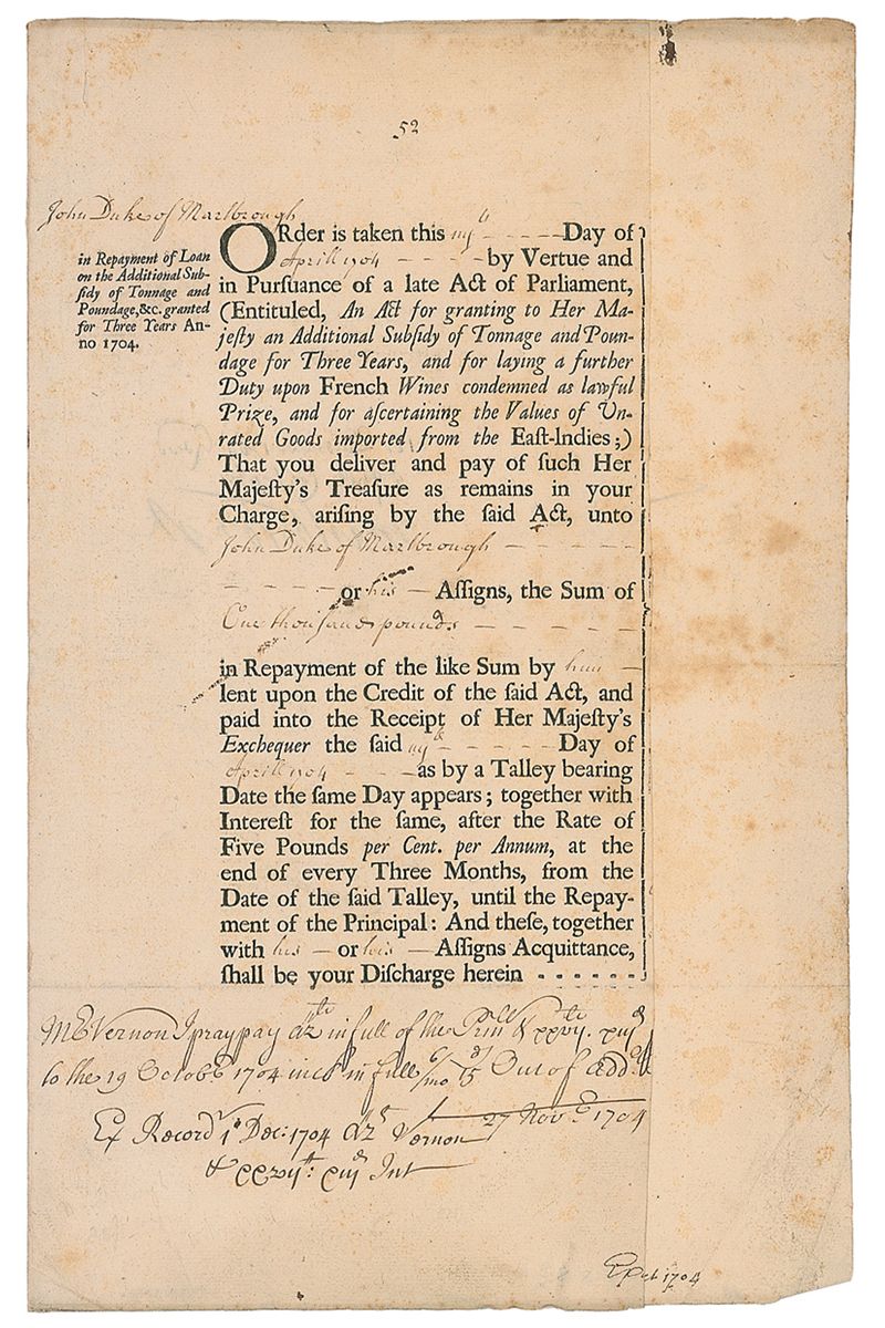 English soldier and statesman (1650–1722) whose career spanned the reigns of five monarchs through the late 17th and early 18th centuries. Endorsement signed “Marlborough,” on the reverse of a one-page partly printed document, 7 x 14, dated April 1704. Document concerns the repayment of a one hundred pound loan. Endorsed on the reverse by Marlborough, dated December 12, 1704. In very good condition, with horizontal folds, and some scattered light toning and foxing.