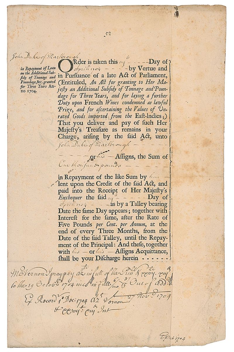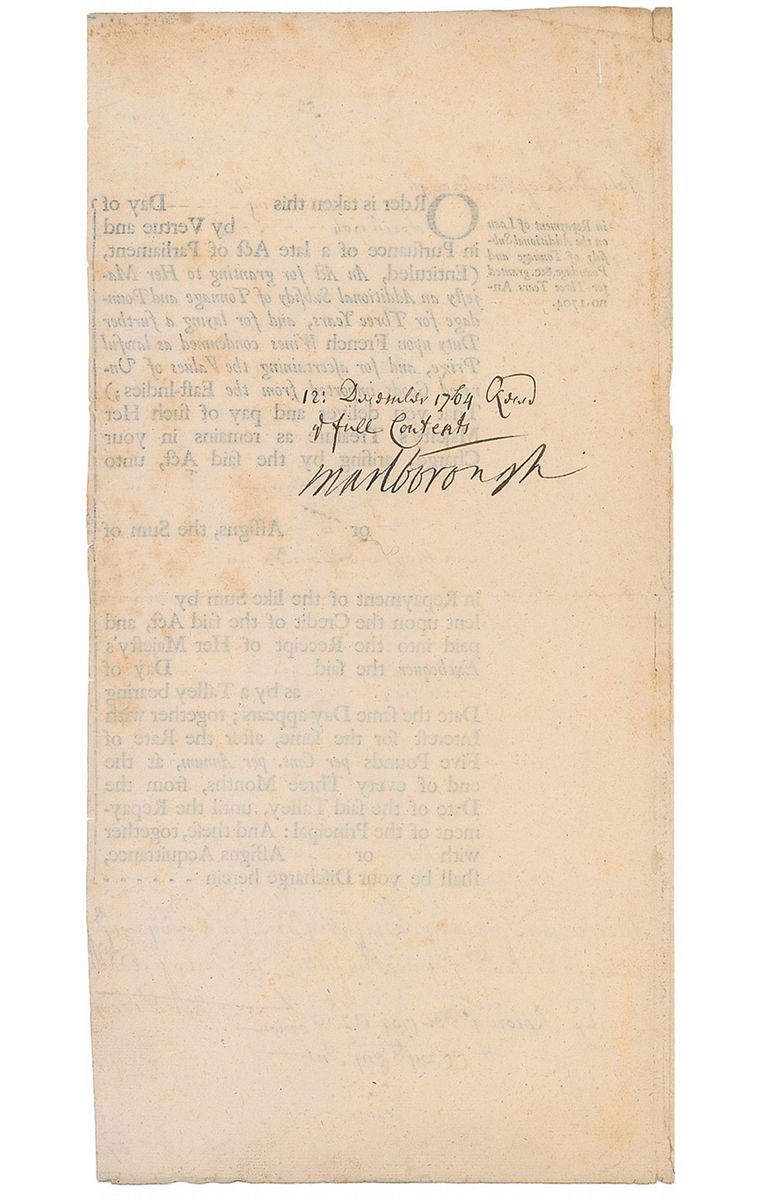 English soldier and statesman (1650–1722) whose career spanned the reigns of five monarchs. Endorsement signed “Marlborough,” on the reverse of a one-page partly printed document, 7 x 14, dated April 1704. Document concerns the repayment of a one hundred pound loan. Endorsed on the reverse by Marlborough, dated December 12, 1704. In very good condition, with horizontal folds, and some scattered light toning and foxing.