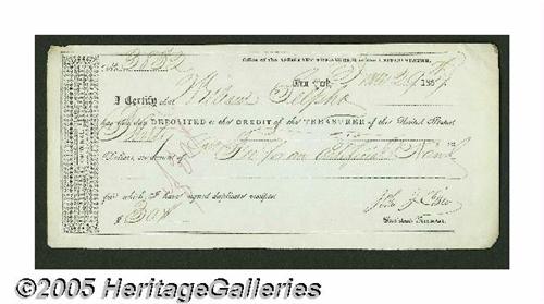 <B>John Cisco Check</B></I> This check was signed by Cisco as assistant Treasurer in New York in 1857. Cisco was the man responsible for the initial distribution of postal currency in New York City and his name appears on the printed permit elsewhere in this catalog.