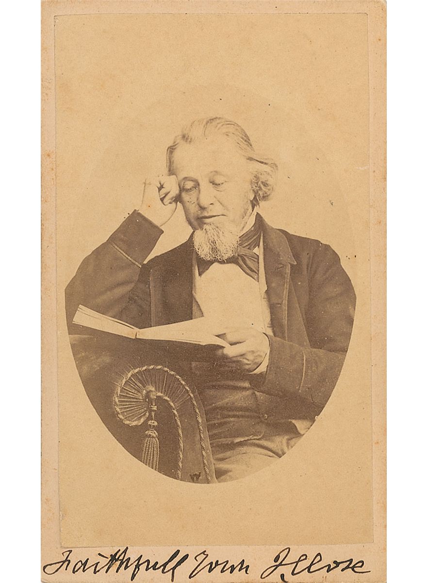 English rhymster (1816–1891) known as ‘Poet Close.’ Original 2.25 x 4 carte-de-visite photo by an anonymous studio, signed in the lower border in black ink, “Faithfully yours, J. Close.” A label affixed to the reverse reads, “Portrait and autograph of J. Close, The Westmoreland Poet. Price one shilling.” In fine condition, with image lightly peeling from backing at lower left and a bit of mild toning.