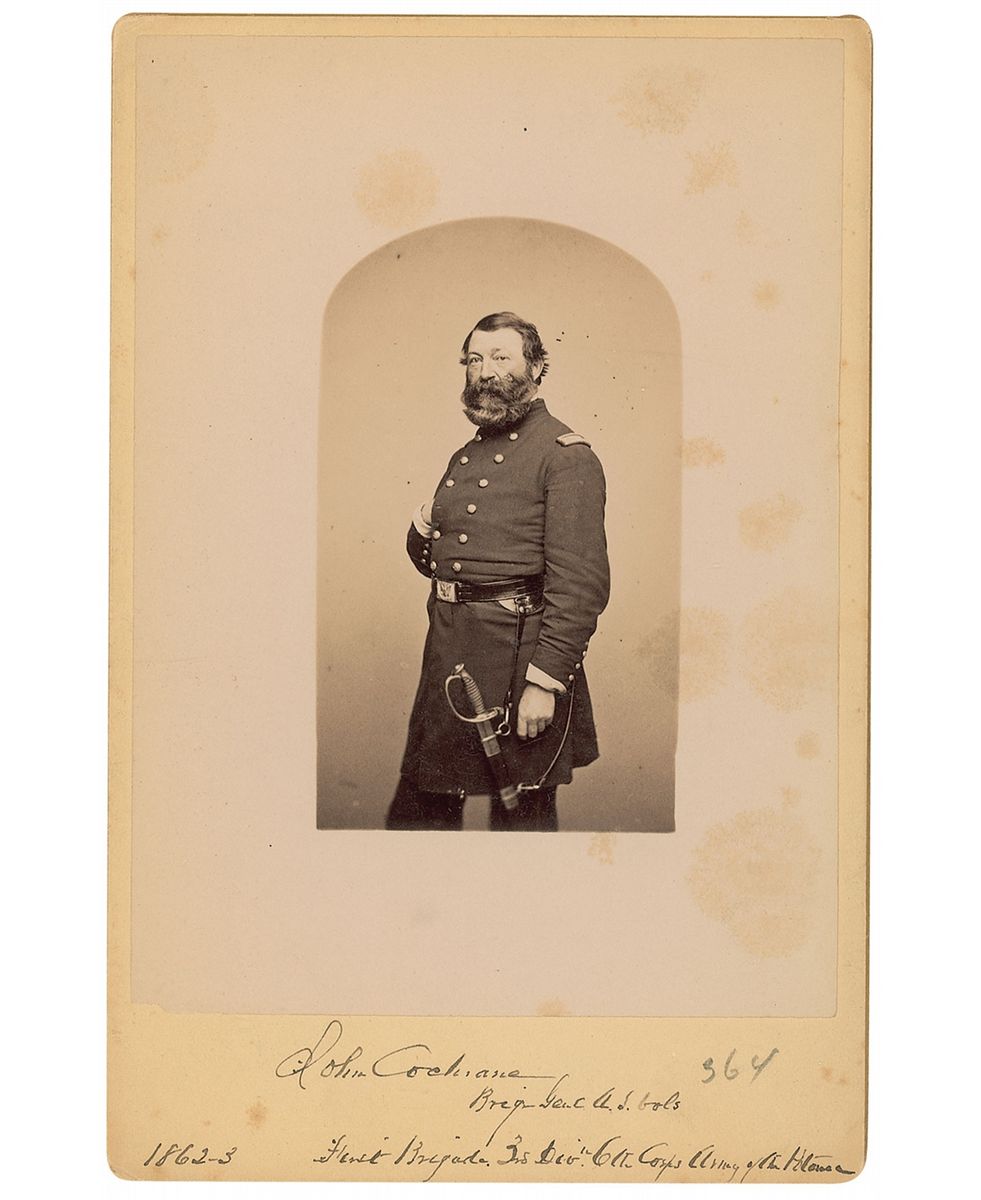 Union general (1813–1898) who later served as New York State attorney general. Original 4.25 x 6.5 cabinet photo, signed in the lower border in black ink, “John Cochrane, Brig Genl U. S. Vols,” with further military information added underneath. Scattered light spots of toning, mainly to borders of image, and a pencil notation near signature, otherwise fine condition.