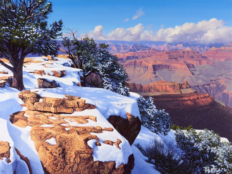 To the unaided eye, this piece appears to be in excellent condition. Inspection under ultraviolet light reveals a normal fluorescence of the artist's pigments. There are no signs of damage or restoration. The piece is framed in a dark antiqued gold frame with a linen liner and a gold fillet. The frame is in very good condition with normal signs of wear. Verso: [handwritten on backing] JC 355 Winter Landscape at Grandeur Point; [label and sticket affixed to backing] El Prado Galleries Inc., Sedona, AZ, Santa Fe, NM