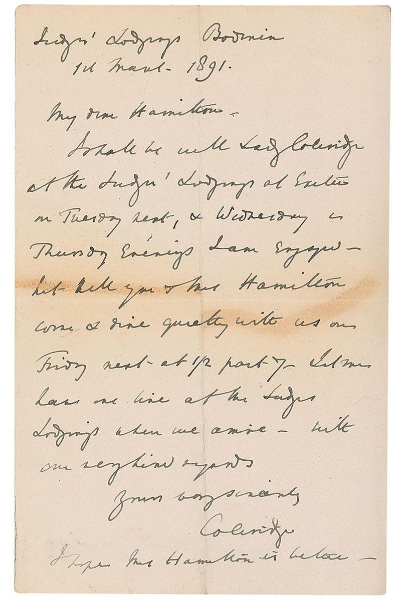 British lawyer, judge and Liberal politician who served as Lord Chief Justice of England (1820–1894). ALS signed “Coleridge,” one page, 4.5 x 7, March 1, 1891. Letter to “Hamilton.” In part: “I shall be with Lady Coleridge at the Judges’ Lodgings at Exeter…but will you & Mrs. Hamilton come & dine quietly with us on Friday next.” Affixed by the left border to a slightly larger sheet. Central vertical and horizontal folds (the vertical fold passing through the first letter of the signature), and a central area of toning, otherwise fine condition.