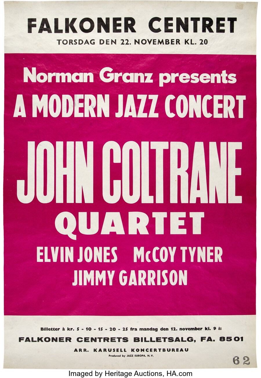 John Coltrane 1962 Copenhagen, Denmark Concert Poster.An original large paper concert poster for jazz great John Coltrane appearing in Copenhagen, Denmark on Thursday night, November 22, 1962. Legendary jazz promoter Norman Granz presented the proceedings, calling it simply "A Modern Jazz Concert." In 1962, "modern jazz" was all the rage. Notice that "62" has been stamped in the lower right corner, which we're assuming was not part of the original printing or posting.