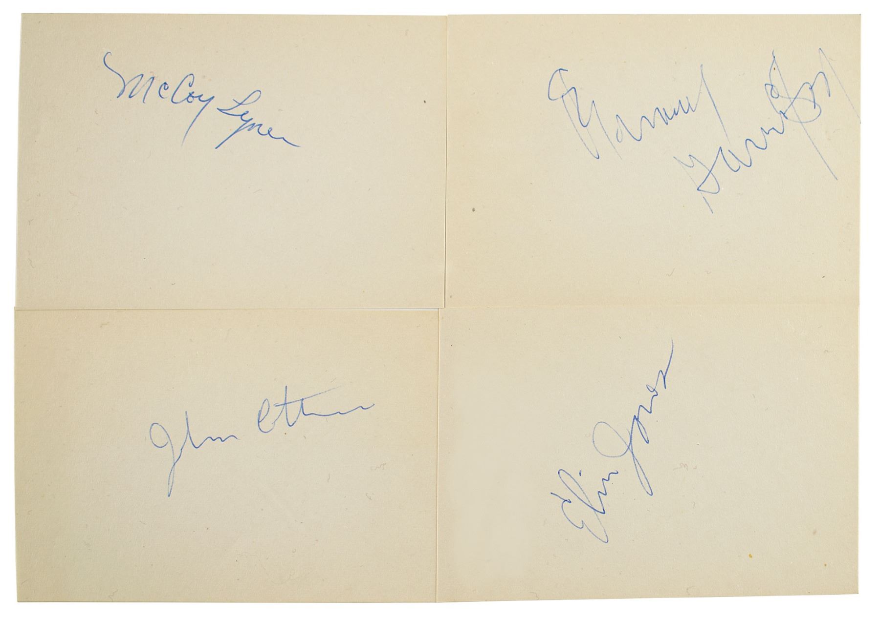 Sought-after collection of four vintage ballpoint signatures, "John Coltrane," "Elvin Jones," "McCoy Tyner," and "Jimmy Garrison," on individual off-white 4.5 x 3 album pages. In fine condition.