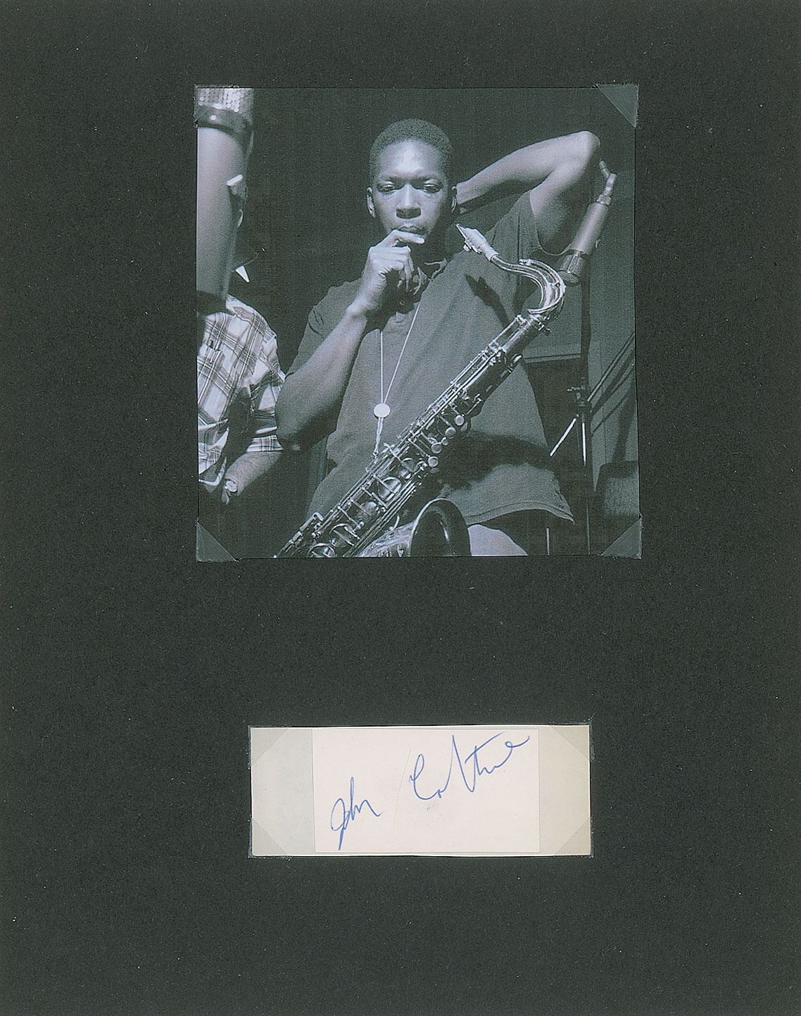 Vintage ballpoint signature, "John Coltrane,” on an off-white 2.25 x 1.25 slip affixed to a slightly larger sheet. Removably corner-mounted to a display sheet with an image of 'Trane.' In fine condition.