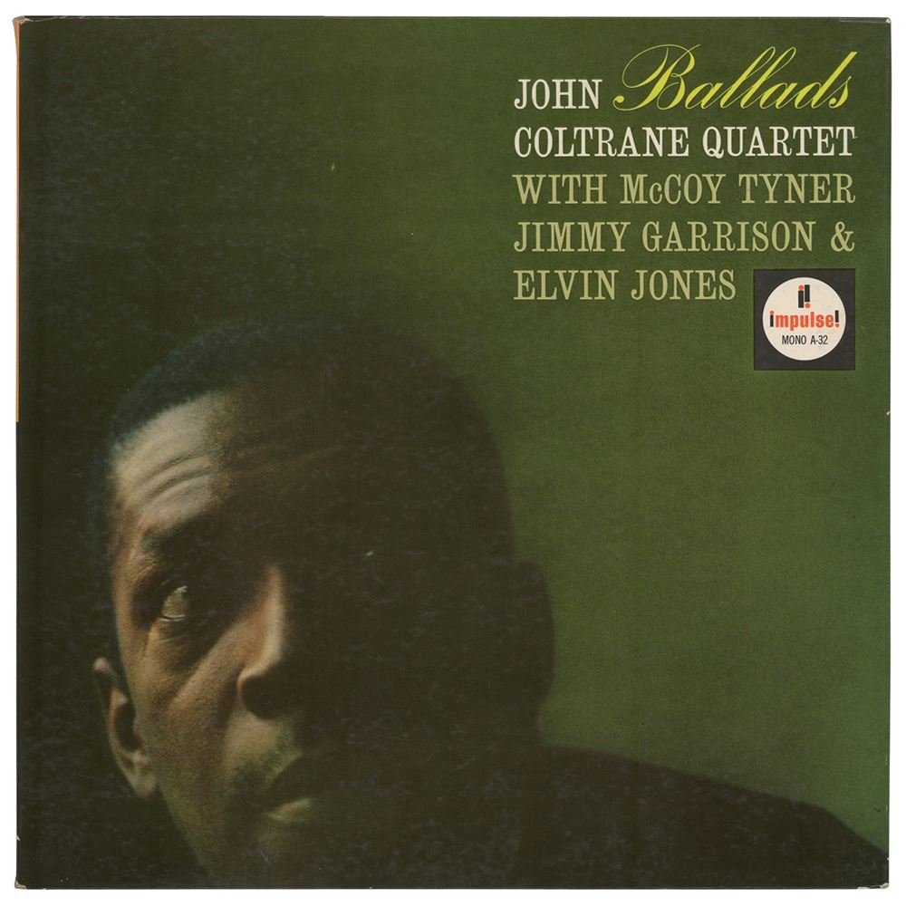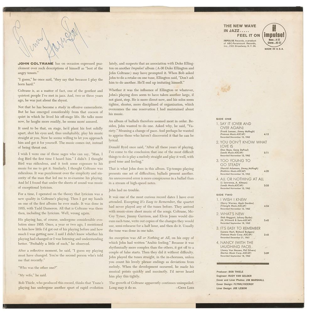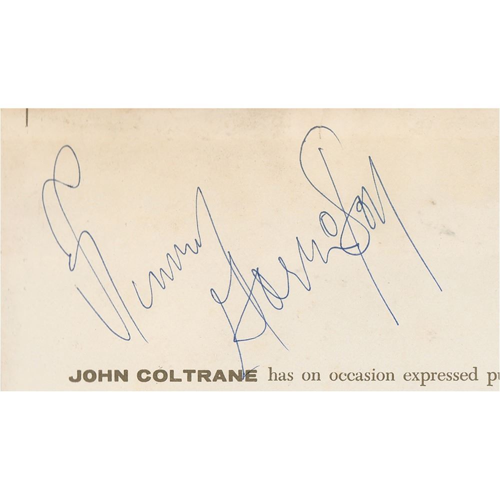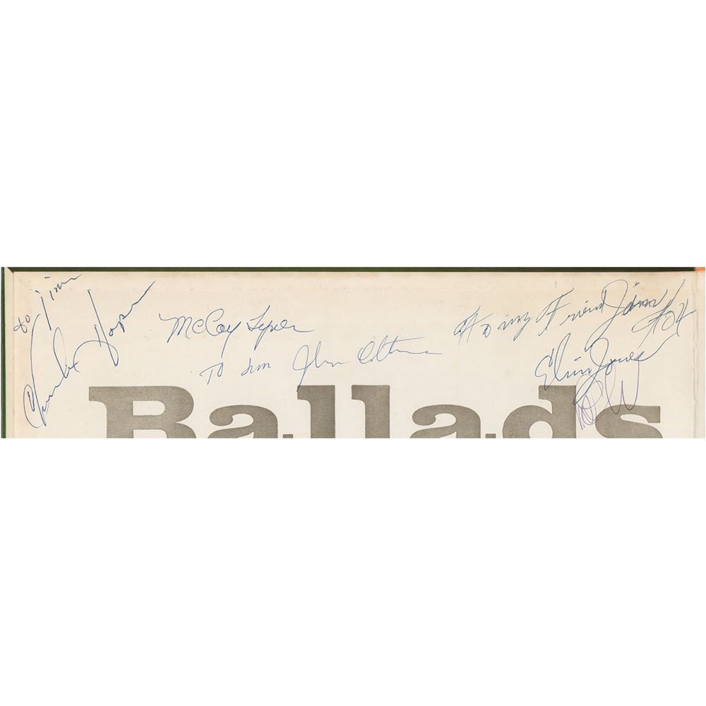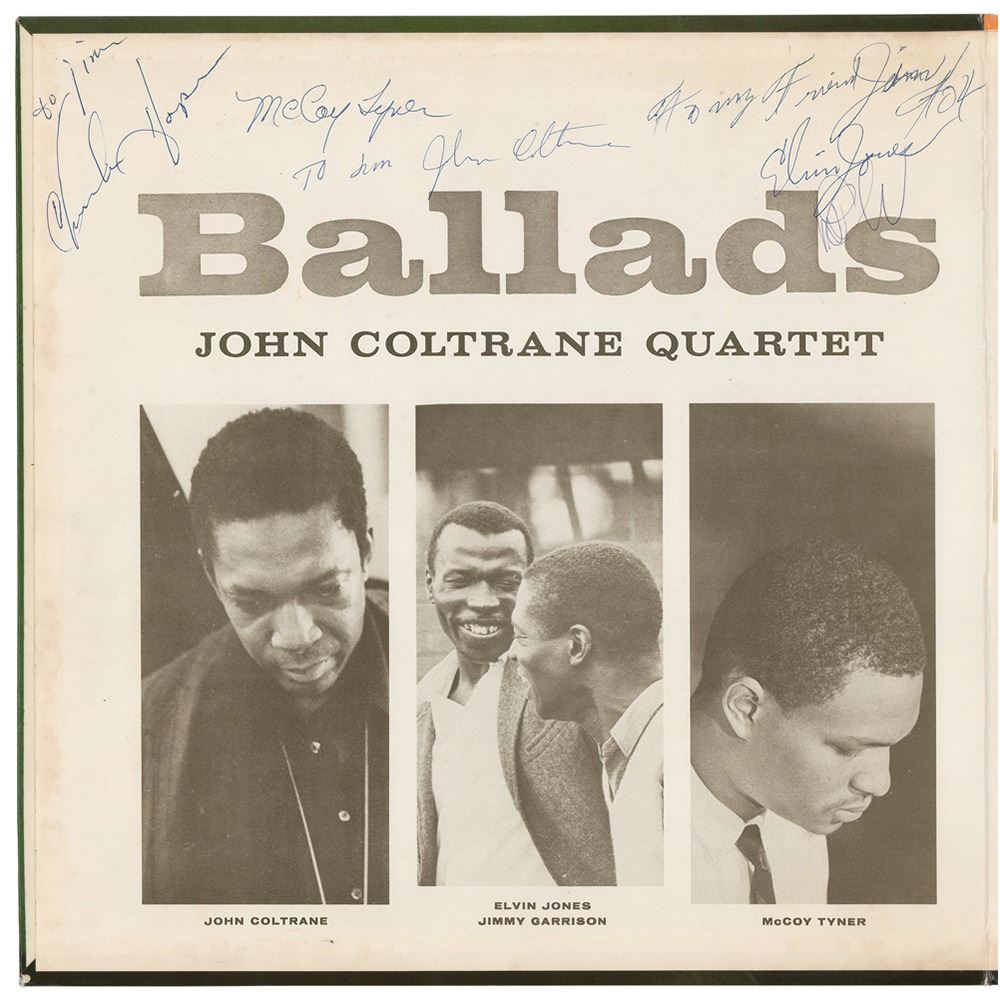 Ballads album by John Coltrane, signed and inscribed on the inner gatefold in ballpoint, "To Jim, John Coltrane," as well as by the other members of his quartet: McCoy Tyner, Elvin Jones, and Jimmy Garrison. In fine condition. The record is included. Originates from the personal collection of James Gang founder Jimmy Fox, who obtained the signatures at The Jazz Temple in Cleveland. A superb fully signed album that, in 2008, was a recipient of the Grammy Hall of Fame award.