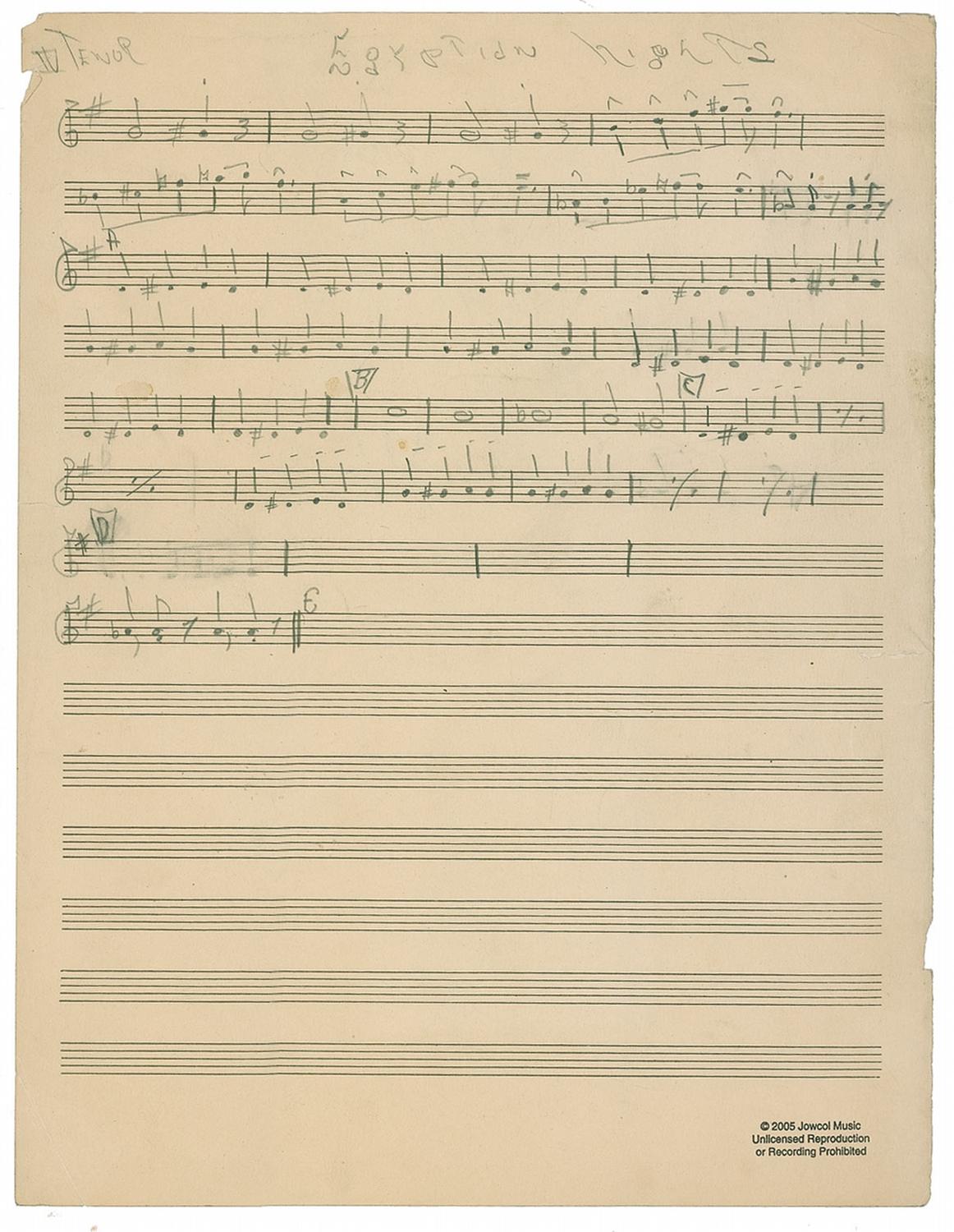 Saxophonist, band leader, and composer (1926–1967) whose brilliant improvisatory skills and experimental spirit made him one of the most influential and highly regarded musicians in the history of jazz. After playing tenor and soprano sax with Dizzy Gillespie, Miles Davis, and Thelonious Monk, he led his own groups and made such classic recordings as ‘Giant Steps,’ ‘My Favorite Things,’ and ‘A Love Supreme.’ He died of liver cancer at the age of 41. Unsigned music manuscript, in pencil, on a preprinted sheet of staff paper, one page, 9.5 x 12, featuring 36 bars of Prokofiev’s ‘Egyptian Nights-Incidental Music from the Play Op. 61,’ apparently a single instrumental part (quite possibly for saxophone). On the reverse, Coltrane sketches a man and a woman standing together, a small revolver, and writes “By Elmer,” possibly a reference to Elmer Snowden, a band leader at the time. The page bears the Coltrane estate’s “2005 Jowcol Music” copyright ink stamp. In very good condition, with light toning and soiling, a few small edge tears, none affecting notations, and some creasing to top corners. A fine and rather lengthy example of Coltrane’s study in music theory.