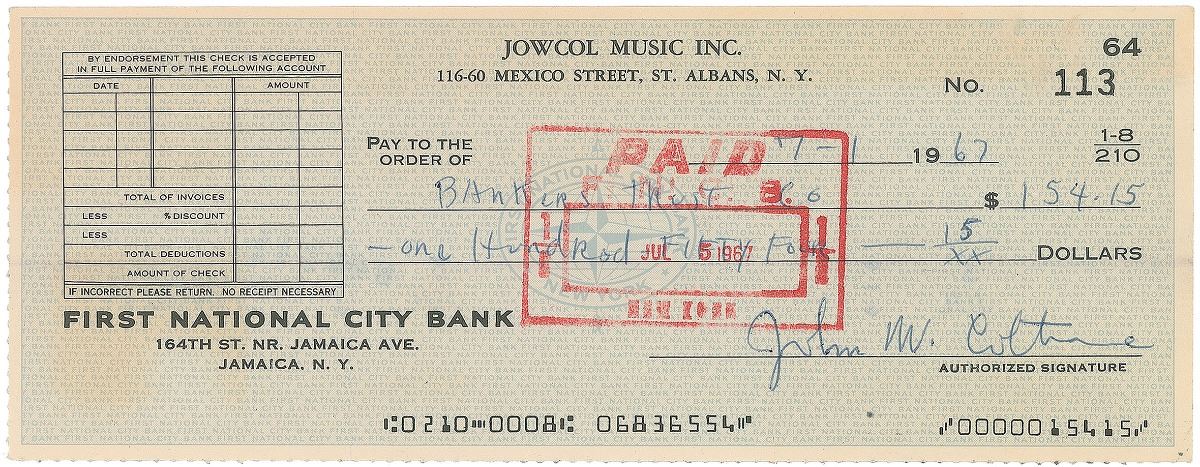 Jowcol Music Inc. business check, 8.25 x 3.25, filled out and signed by Coltrane, “John M. Coltrane,” payable to Banker’s Trust Co. for $154.15, July 1, 1967. In fine condition. A rare and important check dated just 16 days before his untimely death.