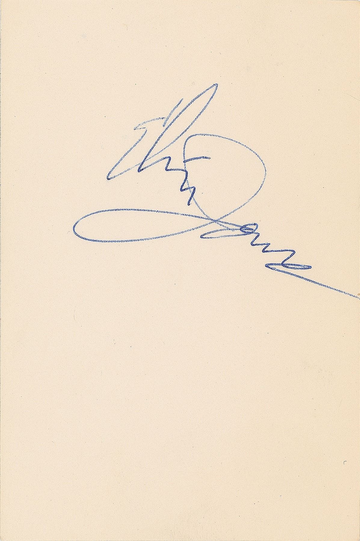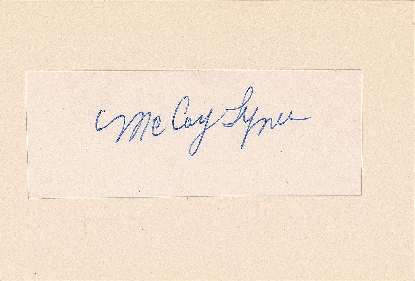 Sought-after vintage ballpoint signature of the revolutionary jazz saxophonist, "John Coltrane,” on an off-white 3.75 x 1.75 slip, affixed to a slightly larger album page. Also includes ballpoint signatures of his bandmates, pianist McCoy Tyner and drummer Elvin Jones, on individual slips. In fine condition. A superlative grouping from these icons of jazz.
