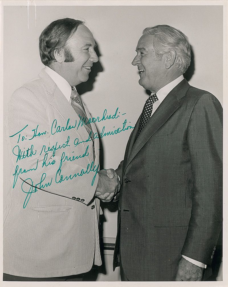 Texas governor who rode in the same car as JFK at the time of the president’s assassination in Dallas, and who himself was struck by a bullet. Glossy 8 x 10 photo, signed and inscribed in green felt tip “To: Hon Carlos Moorhead—With respect and admiration from his friend, John Connally.” In very good condition, with paperclip impression and rippling to top edge and a surface impression from another signature and inscription from another photo placed on top.