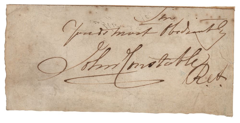 Rare ink signature, "Yours most obediently, John Constable, R. A.," on an off-white 4.75 x 2.25 slip. In fine condition, with light soiling.