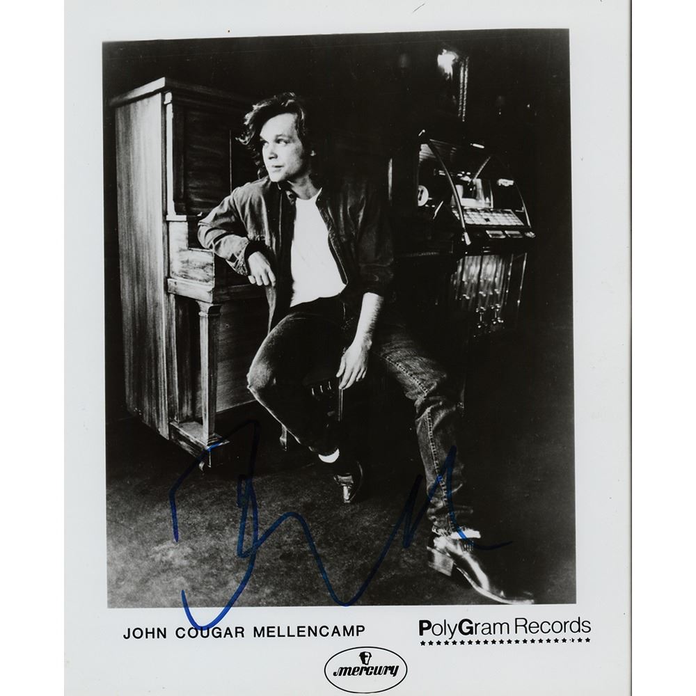 Glossy 8 x 9.75 Mercury / Polygram Records publicity of John Cougar Mellencamp seated at a piano, signed in blue felt tip. In fine condition. Originally obtained by in-person specialist Mike Wehrmann.