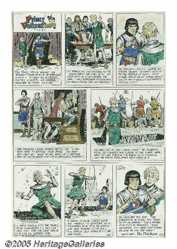 <B>John Cullen Murphy - Prince Valiant Hand Colored Sunday Comic Strip Original Art, dated 4-20-75 (King Features Syndicate, 1975).</B></I> Prince Valiant turns a mouse of a Prince into a lion with sage military wisdom and steely resolve. This hand colored Sunday, numbered #1993, features five superb portraits of Val in action. The image area of this Sunday measures 13" x 19.5". The three tiers of the strip were cut apart and later rejoined; otherwise the art is in Excellent condition.