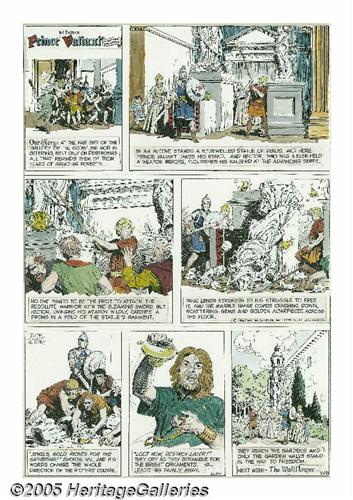 <B>John Cullen Murphy - Prince Valiant Hand Colored Sunday Comic Strip Original Art, dated 12-28-75 (King Features Syndicate, 1975).</B></I> From serving as a model for Norman Rockwell, to studying art with Franklin Booth and George Bridgman, John Cullen Murphy led a life immersed in the field of illustration. After working on his <I>Big Ben Bolt</B></I> strip, Murphy brought his years of experience to Hal Foster's famous feature. This action-packed Sunday, episode #2029, was beautifully hand colored and will make a first-rate display piece for any <I>Prince Valiant</B></I> enthusiast. The image area of the Sunday measures 13" x 19.5". The three tiers of the strip were cut apart and later rejoined; the pasted-on captions show slight glue staining; otherwise the art is in Excellent condition.