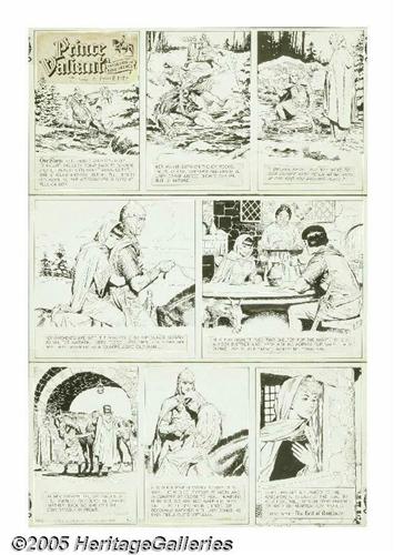 <B>John Cullen Murphy and Hal Foster - Prince Valiant Sunday Comic Strip Original Art, dated 11-1-70 (King Features Syndicate, 1970).</B></I> When Hal Foster decided to retire from his beloved <I>Prince Valiant</B></I> strip, it turned out to be a long and gradual process that took over ten years to complete! Working from Foster's detailed scripts and penciled breakdowns, John Cullen Murphy finished this handsome Sunday, and the strip is from the first year of his stint on the feature. Murphy was in peak form on this Sunday, the figure drawing and background detail are first-rate. The influence of Hal Foster's hand can be seen in the panel compositions. The page was cut between each panel tier and then taped together on the back of the paper. The conjoined tiers combine to form an image area measuring approximately 23" x 34". There is some minor staining and loosening of the title logo and captions; otherwise the art is in Excellent condition. John Cullen Murphy has signed the art just below the final panel's lower border. This is a superb example of a John Cullen Murphy <I>Prince Valiant</B></I>!