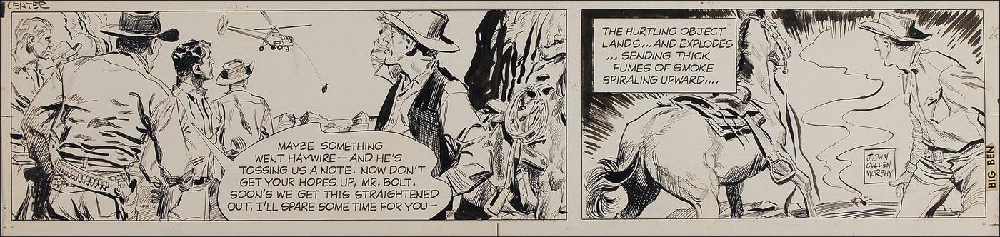 Original hand-inked two-panel Big Ben daily comic strip, dated February 5 [no year] on an off-white 22 x 5.25 piece of artist cardstock. Strip witness a helicopter dropping an explosive device. Signed in black ink on the last panel. Some wrinkling, scattered toning and soiling, and light show-through from an adhesive label on the reverse, otherwise fine condition.
