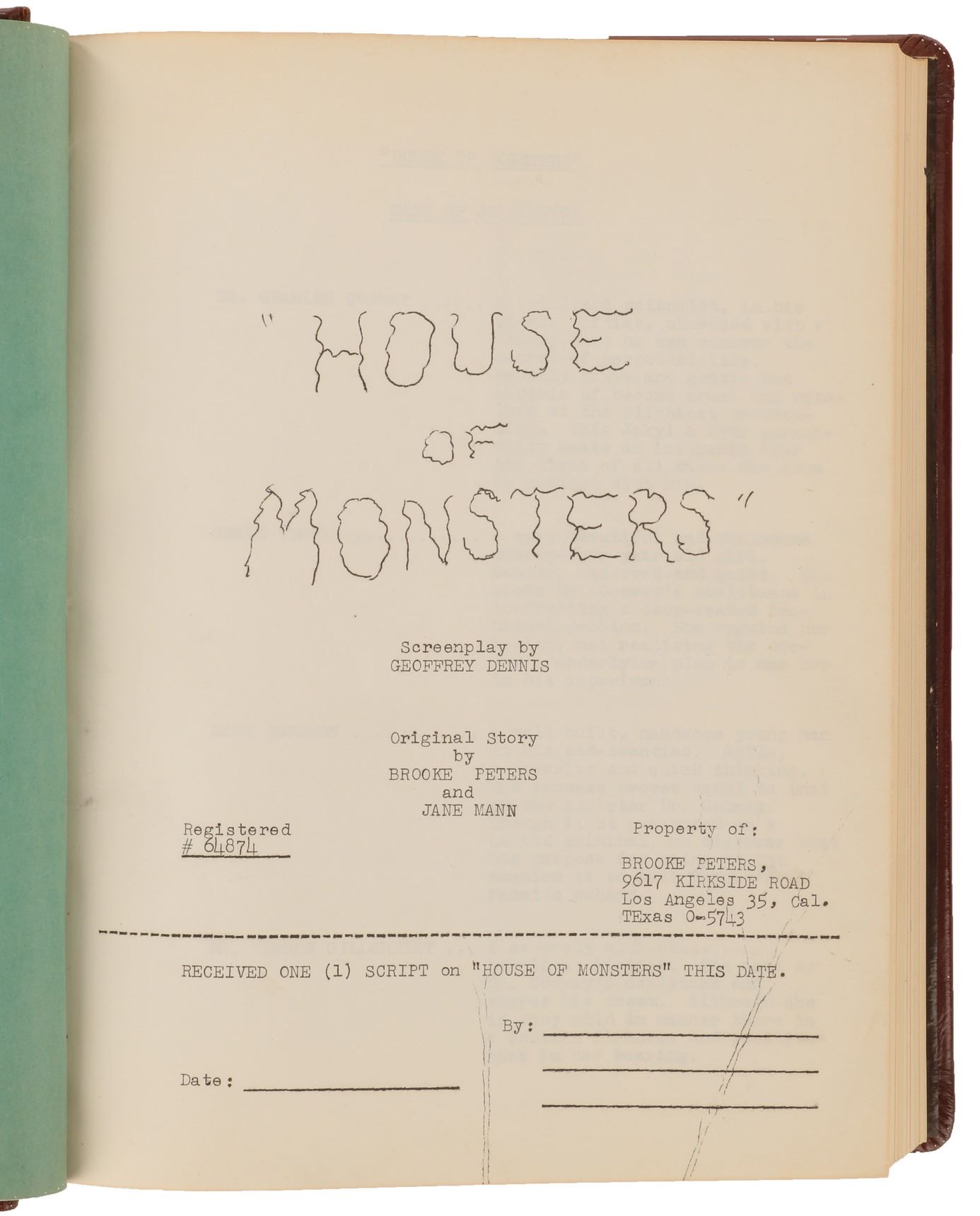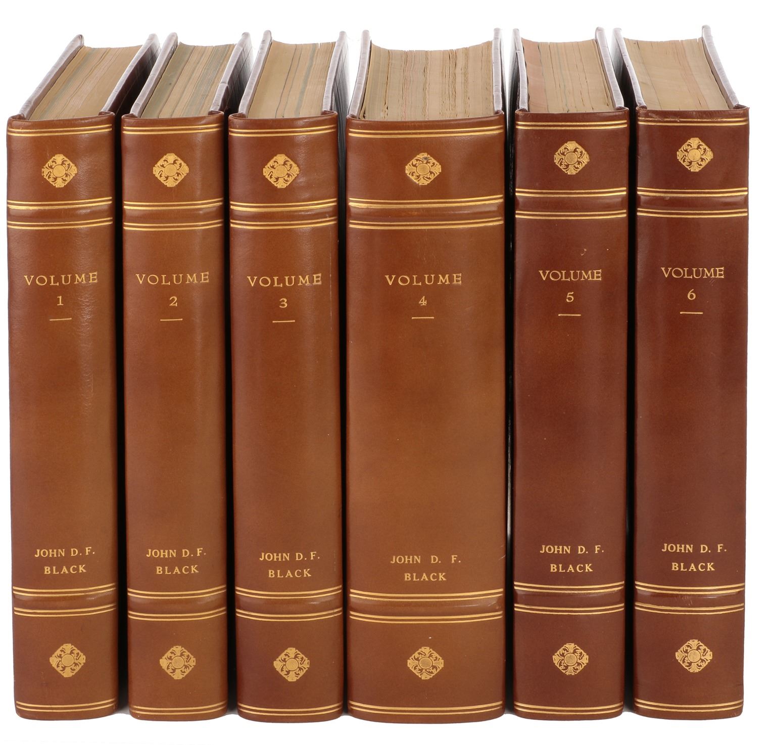 381. John D.F. Black (6) leather bound volumes of scripts.(ca. 1957-1964) Vintage original gorgeous collection of (6) walnut brown leather book bound scripts with gold gilt cover and spine details, labeled Volume 1 through Volume 6, containing an impressive gathering of Black's work for nearly a decade, some titles including: The Unearthly (AKA "House of Monsters"), Lawman "The Son", Hawaiian Eye "The Old Law", The Untouchables "The Cordial Shops", The Fugitive "Fire in the Mountains", Music From Hollywood, and many more. Various drafts and page colors with handwritten notes throughout. A personal note from Black's wife, Mary, states that her husband was working as such a furious pace after 1964, they decided to quit binding his scripts. In fine condition. $600 - $800
