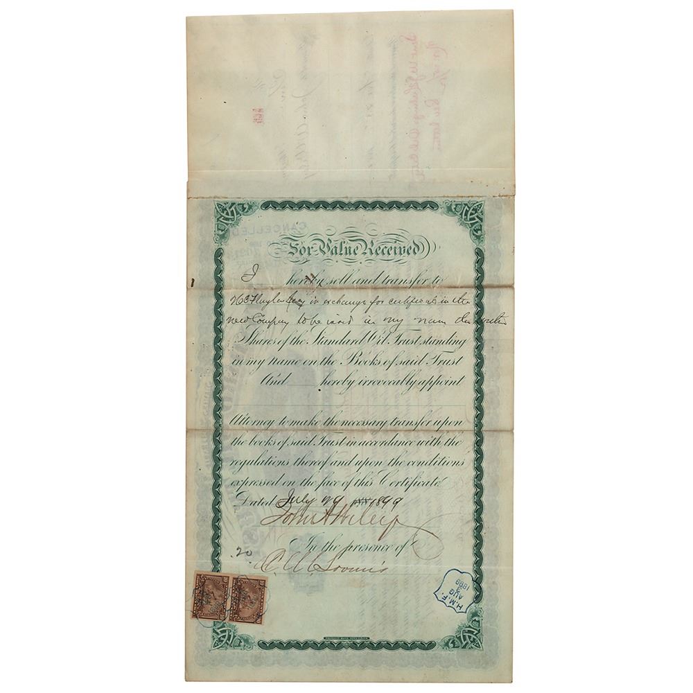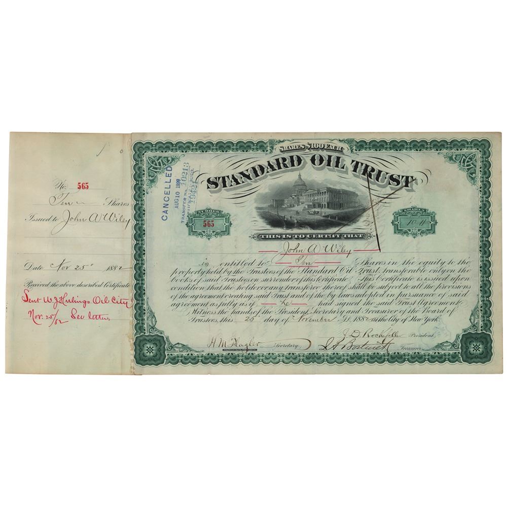 Partly-printed DS, one page, 11.75 x 7.75, November 25, 1882. Stock certificate for ten shares in Rockefeller's Standard Oil Trust issued to John A. Wiley, signed at the conclusion by John D. Rockefeller as president, Henry M. Flagler as secretary, and Jabez A. Bostwick as treasurer. The original receipt remains affixed at the left edge. In fine condition, with the signatures lightly canceled.