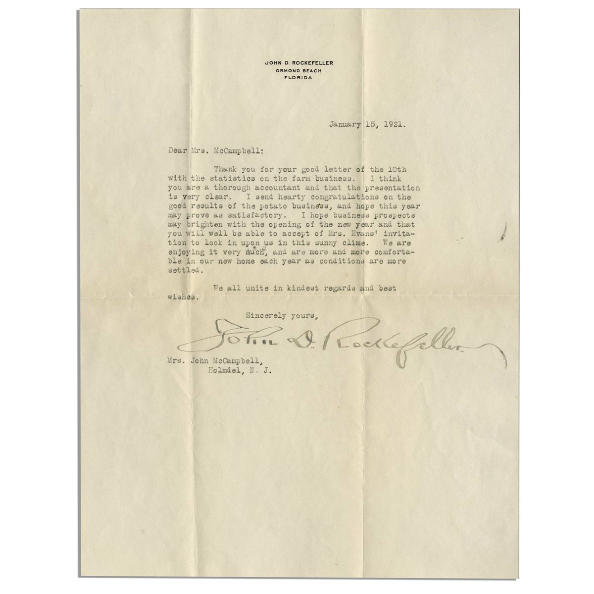 John D. Rockefeller typed letter signed, dated 15 January 1921 on his personal Ormond Beach, Florida stationery. Letter is addressed to Mrs. John McCampbell and reads in full, ''Thank you for your good letter of the 10th with the statistics on the farm business. I think you are a thorough accountant and that the presentation is very clear. I send hearty congratulations on the good results of the potato business, and hope this year may prove satisfactory. I hope business prospects may brighten with the opening of the new year and that you will well be able to accept of Mrs. Evans' invitation to look in upon us in this sunny clime. We are enjoying it very much, and are more and more comfortable in our new home each year as conditions are more settled.'' Signed boldly and clearly, ''John D. Rockefeller'', letter on one page measures 8'' x 10.5'' with minor folds and toning, else near fine. Includes original postmarked envelope.