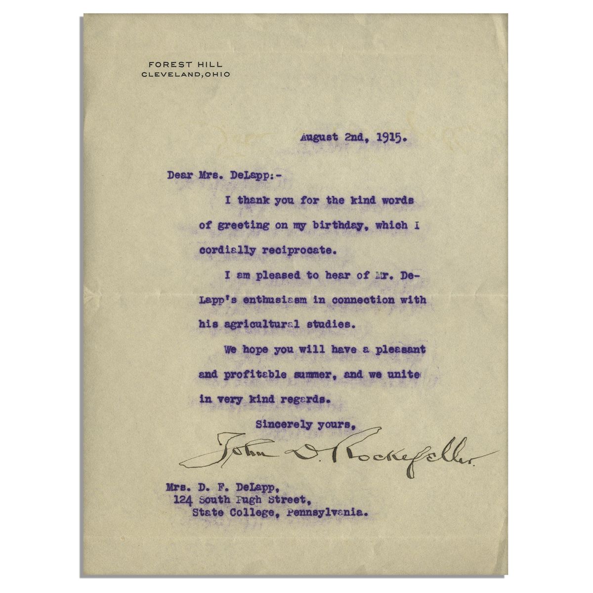 John D. Rockefeller typed letter signed. Dated 2 August 1915, just four years after Standard Oil was found to be in violation of the Sherman Anti-trust Act, letter addressed to one Mrs. DeLapp on his personal stationery reads in part, ''I thank you for the kind words of greeting on my birthday, which I cordially reciprocate. I am pleased to hear of Mr. DeLapp's enthusiasm in connection with his agricultural studies...[signed] John D. Rockefeller''. Single-page letter on card-style stationery measures 5.75'' x 7.75''. Toning and creasing, else near fine.