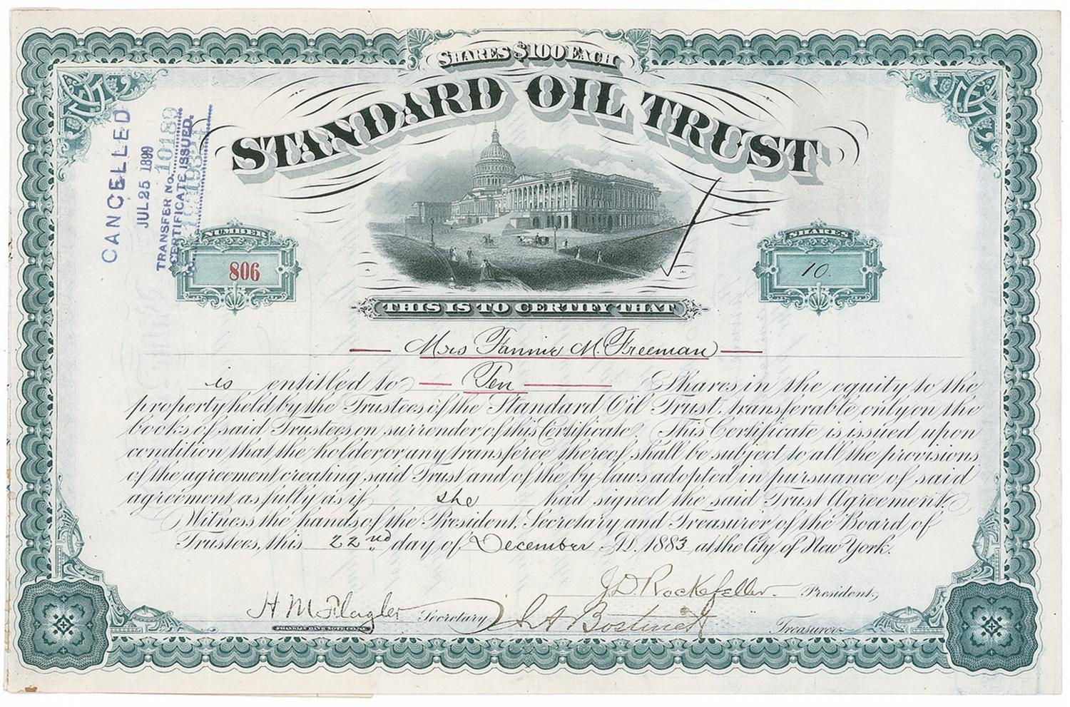 John D. Rockefeller (1839–1937) entered the oil industry at the age of 24 and worked ruthlessly to unify it into the powerful Standard Oil Trust. Henry Flagler (1830–1913), a real estate and railroad entrepreneur, set out to make Florida the ‘Newport of the South’ by providing extensive rail access and grand hotels to lure wealthy vacationers. Engraved DS, one page both sides, 11.25 x 7.75, December 22, 1883. A green stock certificate, featuring a vignette of the US Capitol, for 10 shares of the Standard Oil Trust, issued to Mrs. Fannie M. Freeman, signed “J. D. Rockefeller” as president and “H. M. Flagler” as secretary. The transfer stub remains affixed at left. Several vertical folds, a couple lightly affecting single letters of signature, embossed machine cancellation over Flagler’s signature and lightly affecting bottom of Rockefeller’s, cancellation stamp to top left, and several stamps and notations to reverse, otherwise fine condition. One of American business’s most recognizable company names matched with two business tycoons.