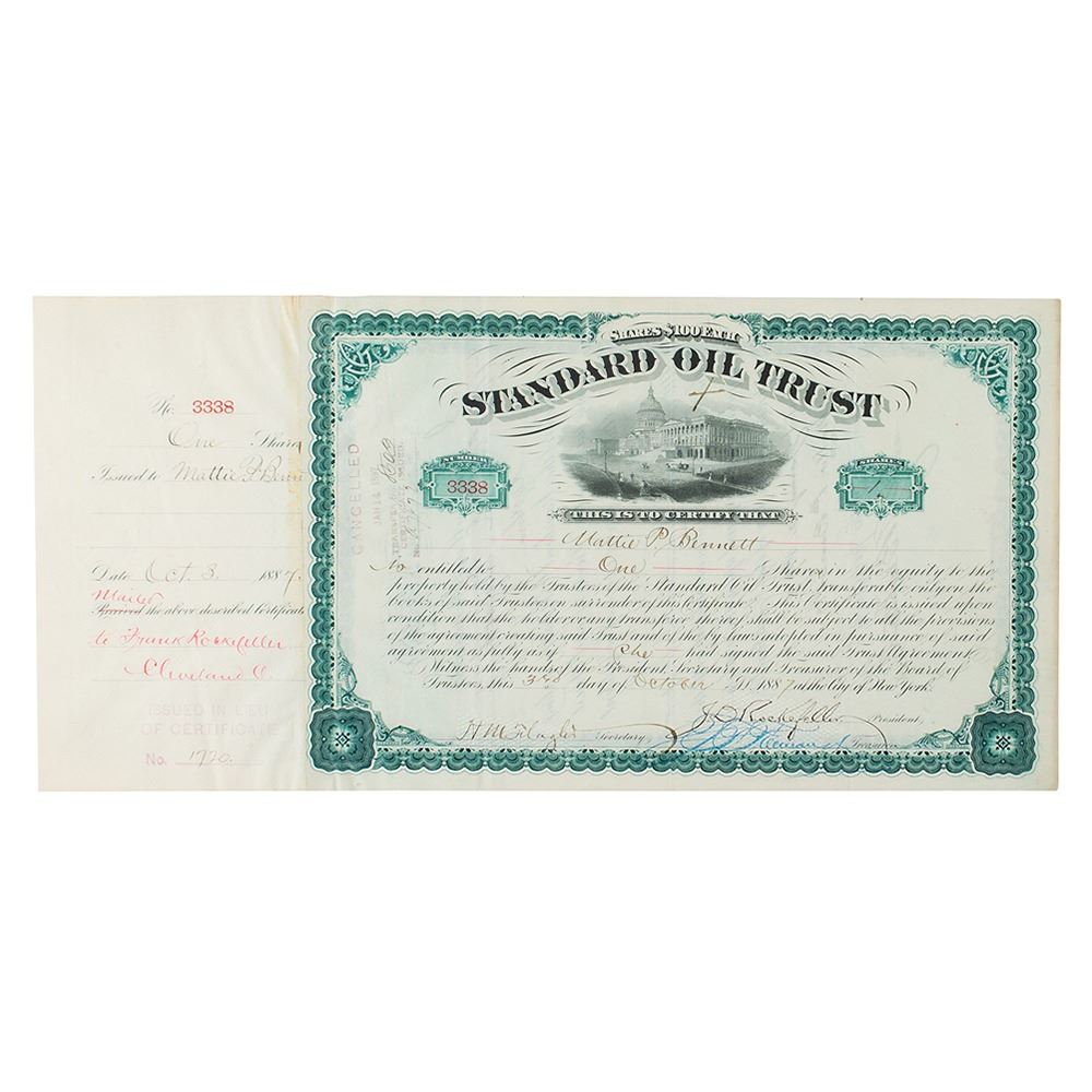 Partly-printed DS, signed J. D. Rockefeller and "H. M. Flagler," one page, 11.75 x 7.75, October 3, 1887. Stock certificate for one share in Rockefeller's Standard Oil Trust issued to Mattie P. Bennett, signed at the conclusion by John D. Rockefeller as president, Henry M. Flagler as secretary, and Joel Francis Freeman as treasurer. The attached receipt is one of few known to mention Frank Rockefeller, the younger brother of Standard Oil co-founders John Davison Rockefeller and William Avery Rockefeller, Jr. Frank Rockefeller had a falling out with his brothers and left Standard Oil in 1898, refusing to speak to either of them for the rest of his life. In fine condition.
