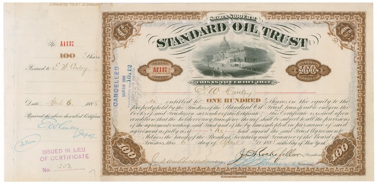 American entrepreneur (1839–1937) who entered the oil industry at the age of twenty-four and worked ruthlessly to unify his business interests into the powerful Standard Oil Trust. DS, signed “J. D. Rockefeller,” one page, 16 x 7.75, April 6, 1888. Brown stock certificate for 100 shares of Standard Oil issued to E. W. Conley, signed at the bottom, as president of Standard Oil, by Rockefeller. In very good condition, with embossed machine cancellation to signatures slightly perforating paper, attached stub to edge of certificate, scattered light toning, and previous storage folds. An eye-catching example.