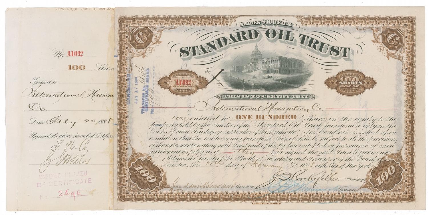 Attractive DS, signed “J. D. Rockefeller,” one page, 16 x 8, February 20, 1888. Brown stock certificate for 100 shares of Standard Oil issued to the International Navigation Company, signed at the bottom, as president of Standard Oil, by Rockefeller. In very good condition, with an embossed machine cancellation to signatures, slightly perforating paper, attached stub to edge of certificate, light overall toning, scattered creases and wrinkles, and previous storage folds. A desirable and uncommon example of a ‘brown’ stock certificate.