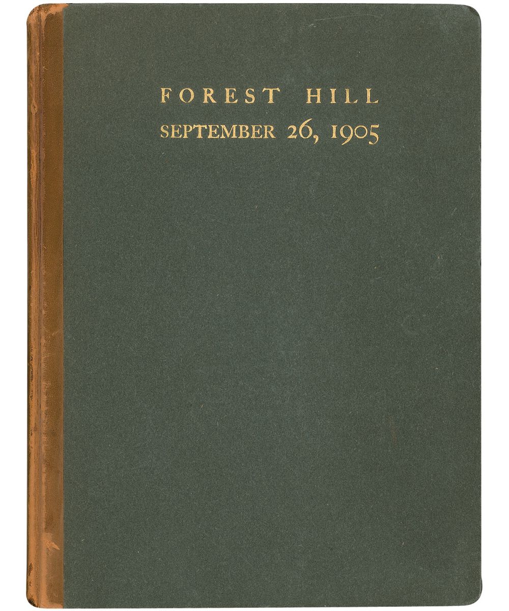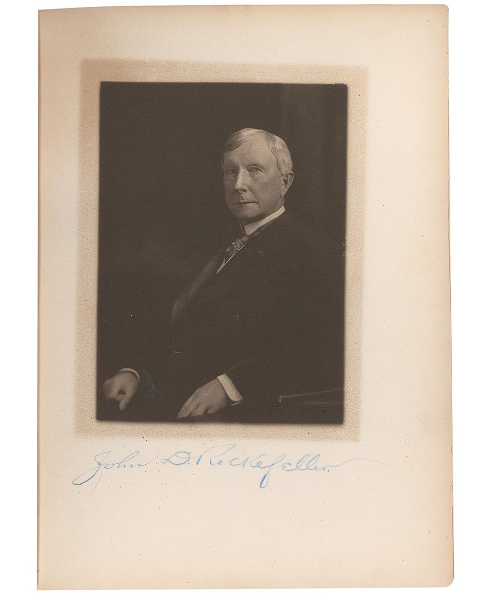 Signed book: Forest Hill September 26, 1905. Limited edition of 425 copies (This being No. 99 presented to Mr. H. P. Dyer). Cleveland: Vinson and Korner Co. Hardcover, 7.5 x 10. Signed in the lower border in blue pencil of the frontispiece portrait of Rockefeller. In very good condition, with light toning to first and last free-end page and both pastedowns, mirroring of portrait on protective tissue paper, some light wear to covers, and some wear and flaking to leather spine.