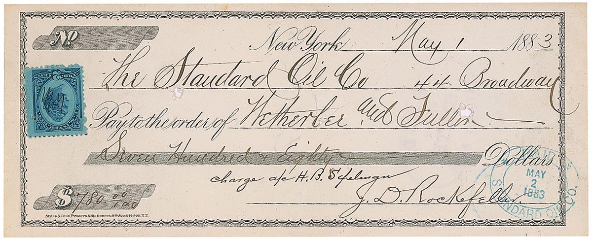 The Standard Oil Co. business check, 8.25 x 3.25, filled out in another hand and signed by Rockefeller, “J. D. Rockefeller,” payable to Wetherbee and Fuller for $780, May 1, 1883. Check bears a two-cent revenue stamp affixed to the left side. In fine condition, with expected bank and cancellation holes (one stamp affecting the last few letters of his signature). Rockefeller signed this check at an especially meaningful time in the company’s history, as just one year earlier he had formed the trust that allowed Standard Oil to control other companies in the industry—eventually, Standard gained control of nearly 90 percent of the country’s oil production. A fantastic Rockefeller item as it is associated with his business and finances.