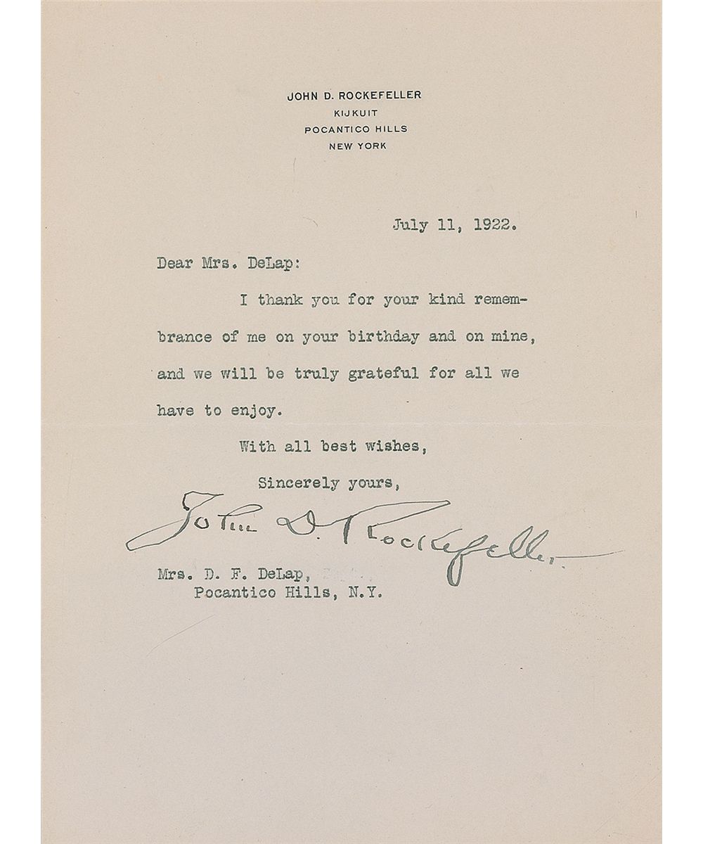 TLS, one page, 5.75 x 7.75, personal letterhead, July 11, 1922. Letter to D. F. DeLap. In full: “I thank you for your kind remembrance of me on your birthday and on mine, and we will be truly grateful for all we have to enjoy.” In very fine condition.
