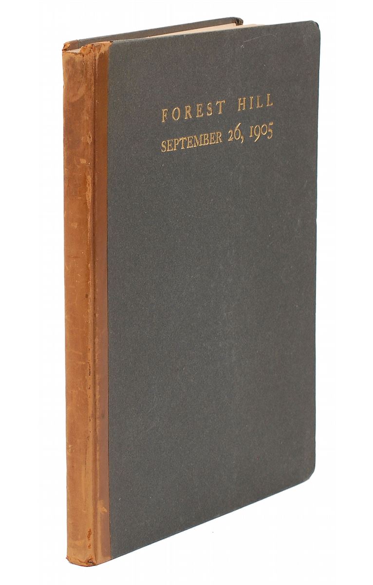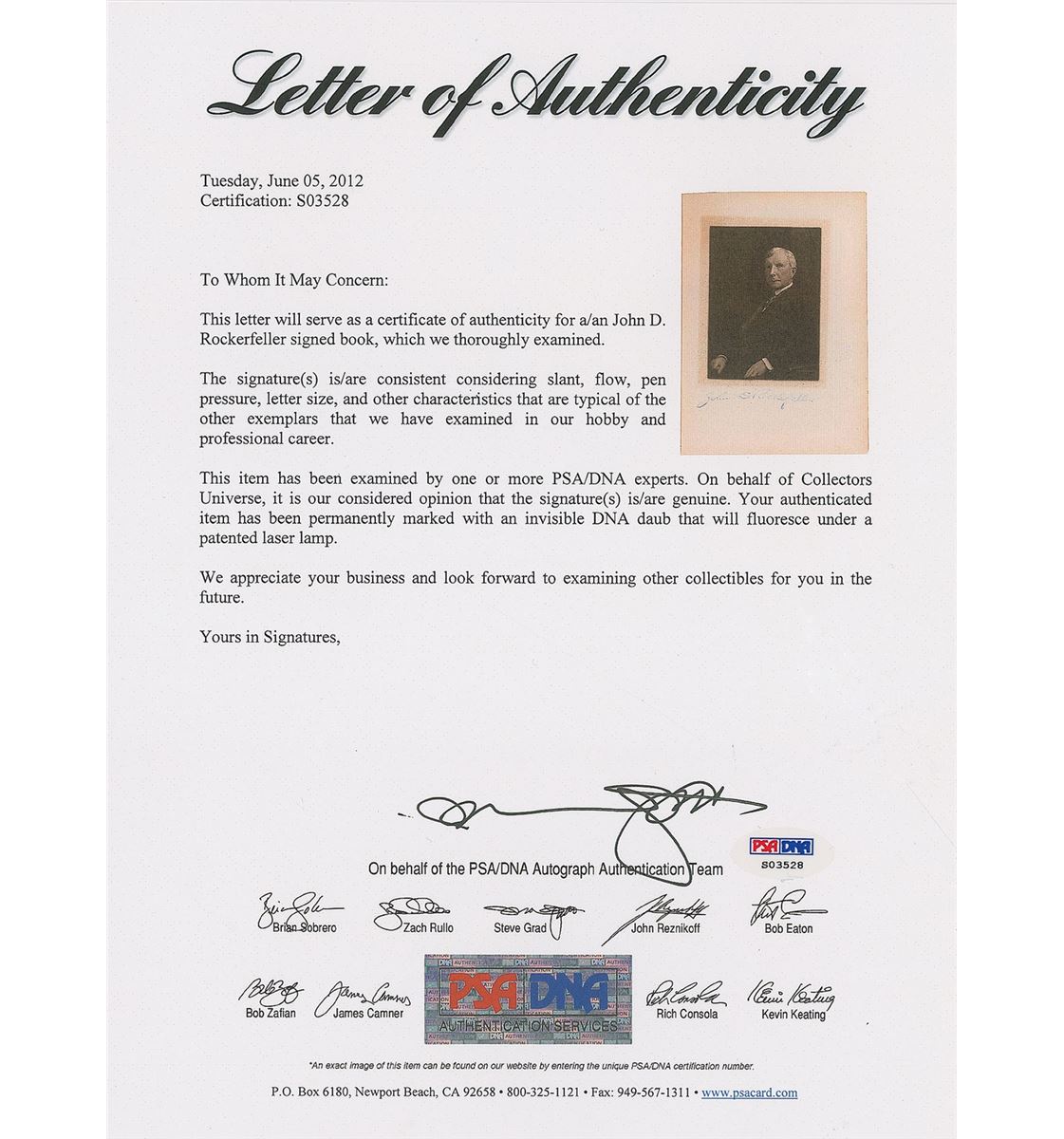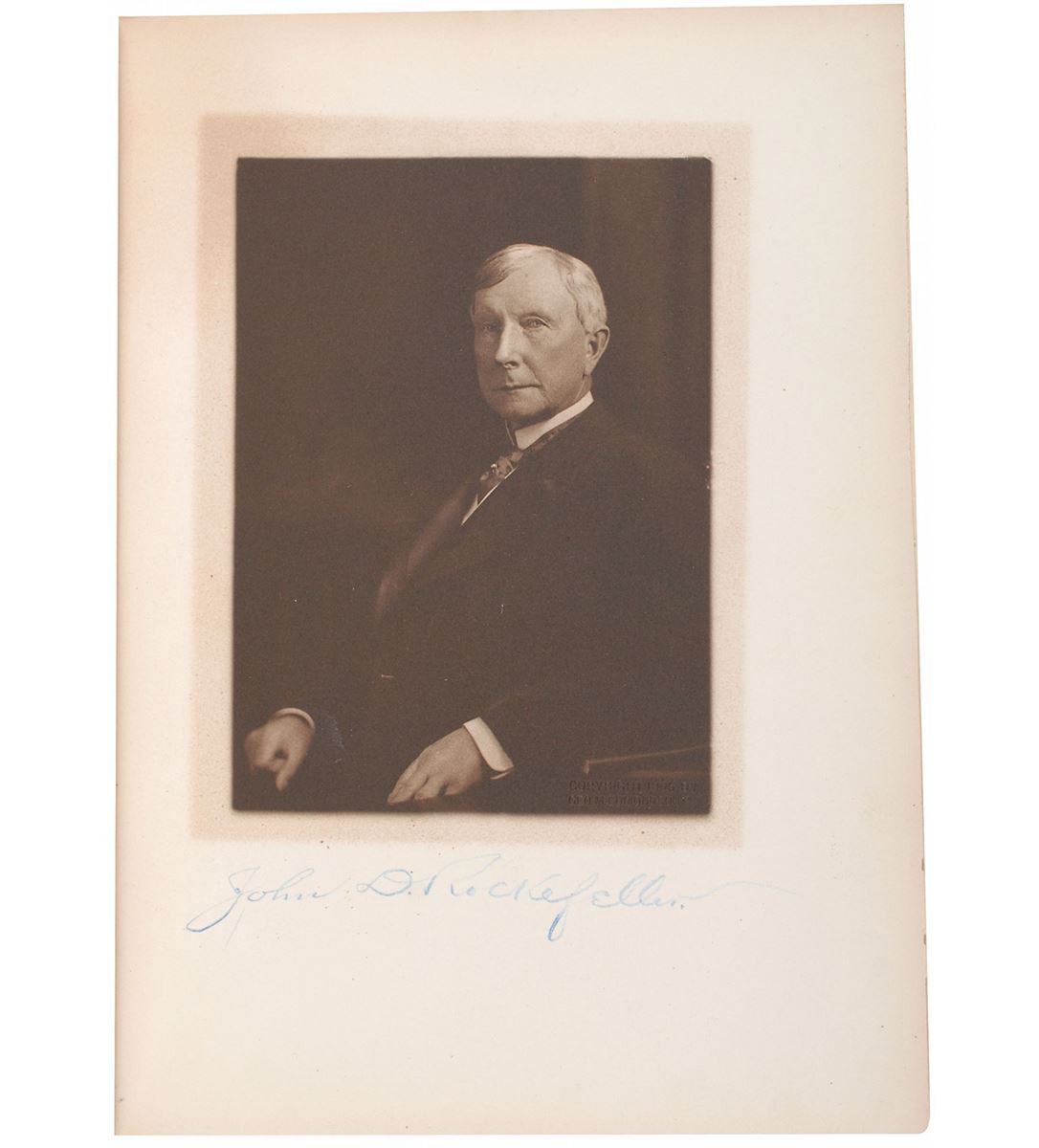 Signed book: Forest Hill, September 26, 1905. Limited edition, numbered 99/425. Cleveland: The Vinson and Korner Co., 1905. Hardcover, 7.5 x 10. Nicely signed in the lower border of the frontispiece portrait in blue pencil, “John D. Rockefeller.” The colophon notes that this example was presented to Mr. H. P. Dyer. Autographic condition: fine. Book condition: VG/None. Accompanied by a full letter of authenticity from PSA/DNA. The book commemorates a gathering held to honor Rockefeller’s contributions to the city of Cleveland, where he spent his adolescence and built his first business in the early 1860s. Thanks to Rockefeller, by the end of the Civil War Cleveland had become one of the five main oil refining centers in the US. The book features the brief addresses given at the event as well as the facsimile signatures of the attendees. A scarce and exceptional limited edition commemorating the great industrialist’s achievements.