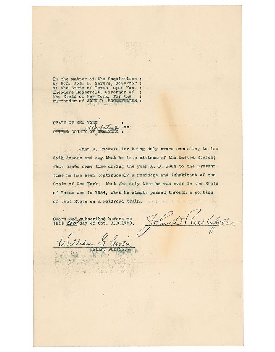 Carbon DS, one page, 8 x 13, October 20, 1900. An unusual legal document headed, “In the matter of the Requisition by Hon Jos. D. Sayers, Governor of the State of Texas, upon Hon. Theodore Roosevelt, Governor of the State of New York, for the surrender of John D. Rockefeller.” Rockefeller testifies that “he has been continuously a resident and inhabitant of the State of New York; that the only time he was ever in the State of Texas was in 1884, when he simply passed through a portion of the State on a railroad train.” Signed at the conclusion by Rockefeller and countersigned by a notary public. In very good condition, with expected document wear, a large band of toning to the right side (passing through his middle initial), and scattered brushing to the text.