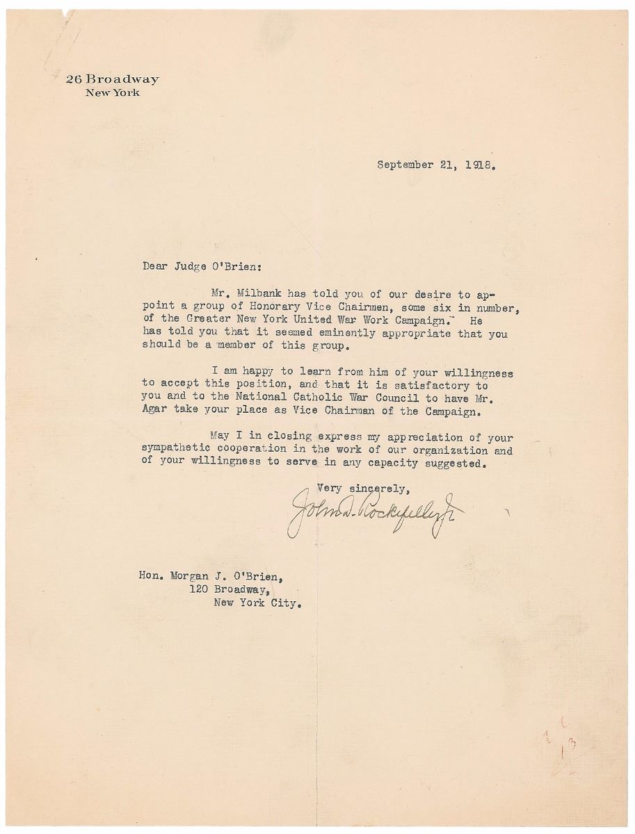 TLS signed “John D. Rockefeller, Jr.,” one page, 8 x 10.5, September 21, 1918. Letter to New York Supreme Court Judge Morgan J. O’Brien, in part: “Mr. Milbank has told you of our desire to appoint a group of Honorary Vice Chairmen, some six in number, of the Greater New York United War Work Campaign. He has told you that it seemed eminently appropriate that you should be a member of this group. I am happy to learn from him of your willingness to accept this position, and that it is satisfactory to you and to the National Catholic War Council to have Mr. Agar take your place as Vice Chairman of the Campaign.” Central vertical and horizontal folds (a vertical fold passing through a single letter of the signature), slight soiling, office notations to lower right corner, and a chip and paperclip impression to top edge, otherwise fine condition.