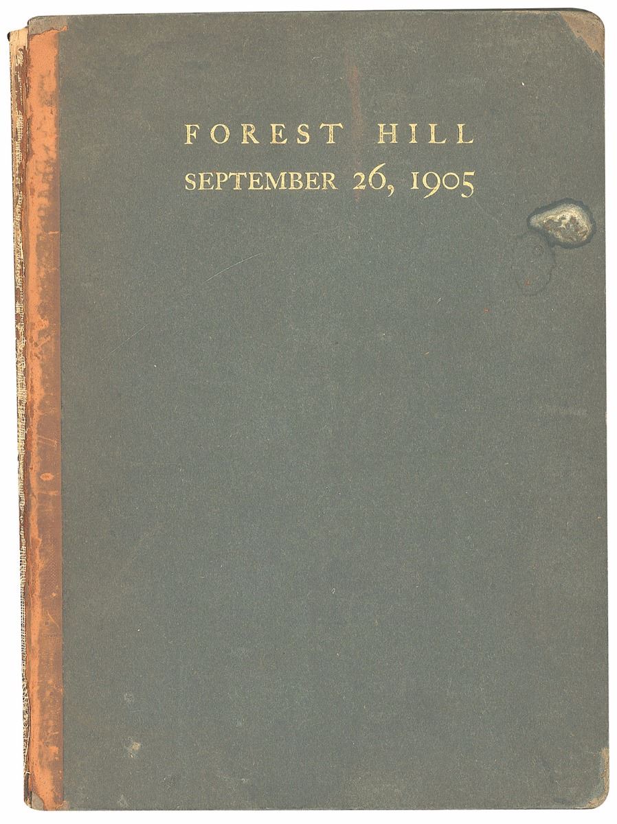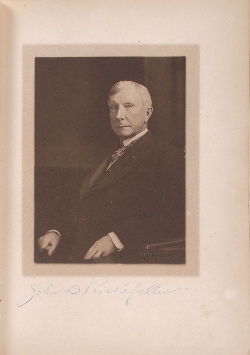 Signed book: Forest Hill, September 26, 1905. Limited edition, numbered 175/425. Cleveland: The Vinson and Korner Co., 1905. Hardcover, 7.5 x 10. Nicely signed in the lower border of the frontispiece portrait in blue pencil, “John D. Rockefeller.” The colophon notes that this example was presented to Mr. G. A. Hyde. Autographic condition: fine, with slight soiling. Book condition: G/None, with detached front cover. The book commemorates a gathering held to honor Rockefeller’s contributions to the city of Cleveland, where he spent his adolescence and built his first business in the early 1860s. Thanks to Rockefeller, by the end of the Civil War Cleveland had become one of the five main oil refining centers in the US. The book features the brief addresses given at the event as well as the facsimile signatures of the attendees. A scarce and exceptional limited edition commemorating the great industrialist’s achievements.