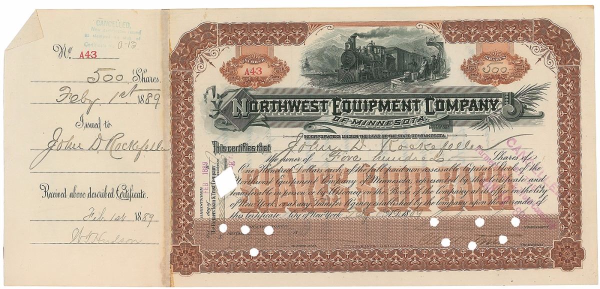 Partly-printed DS, one page, 11.5 x 7.5, February 1, 1889. Stock certificate issued to Rockefeller for five hundred shares in the Northwest Equipment Company of Minnesota, signed on the reverse by Rockefeller. In fine condition.