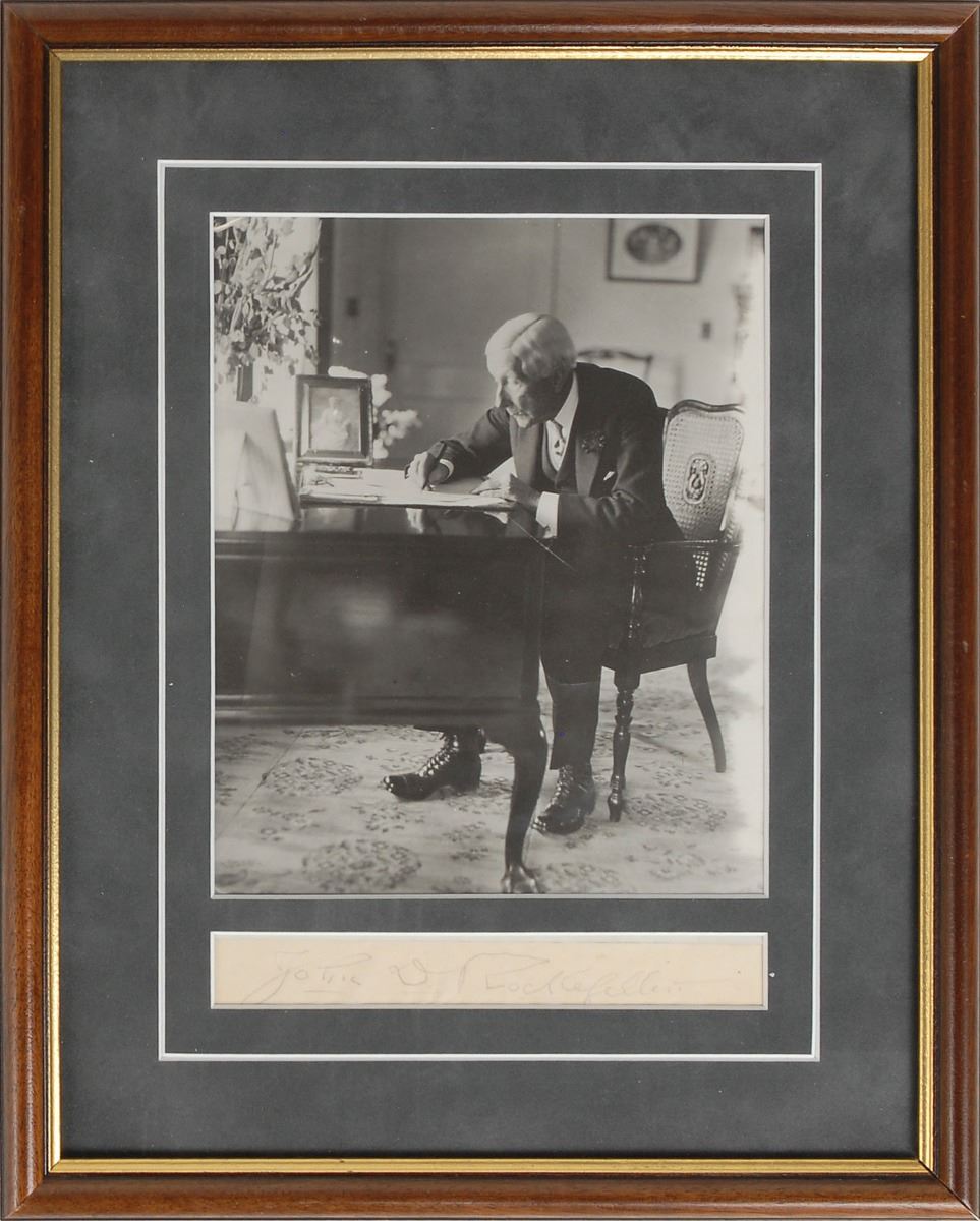 Large pencil signature, “John D. Rockefeller,” on an off-white 6.75 x .75 slip. Matted and framed with a photo to an overall size of 12 x 15. In fine condition.