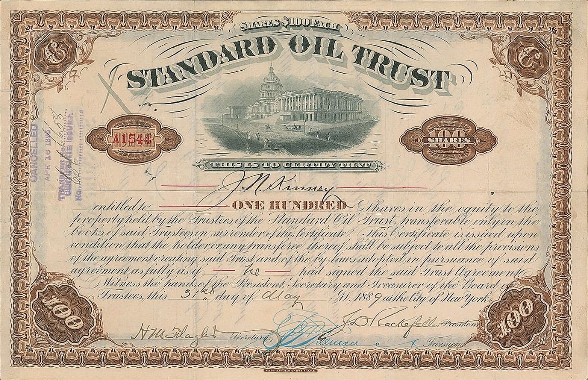 Sought-after partly-printed DS, signed “J. D. Rockefeller,” one page, 11.75 x 7.75, May 31, 1889. Stock certificate for one hundred shares in the Standard Oil Trust issued to “J. N. Kinney.” Nicely signed at the conclusion in black ink by Rockefeller as the company’s president and countersigned by Henry M. Flagler as secretary. Receipt stub affixed to left side. In fine condition.