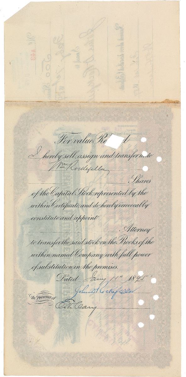 Partly-printed DS, one page, 11.5 x 7.5, February 1, 1889. Stock certificate issued to Rockefeller for five hundred shares in the Northwest Equipment Company of Minnesota, signed on the reverse by Rockefeller. In fine condition.