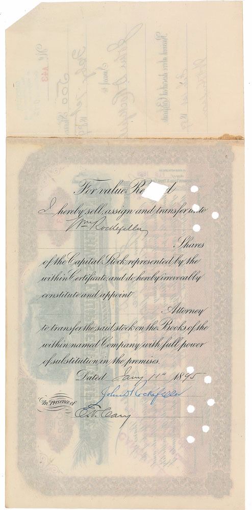 Partly-printed DS, one page, 11.5 x 7.5, February 1, 1889. Stock certificate issued to Rockefeller for five hundred shares in the Northwest Equipment Company of Minnesota, signed on the reverse by Rockefeller. In fine condition.